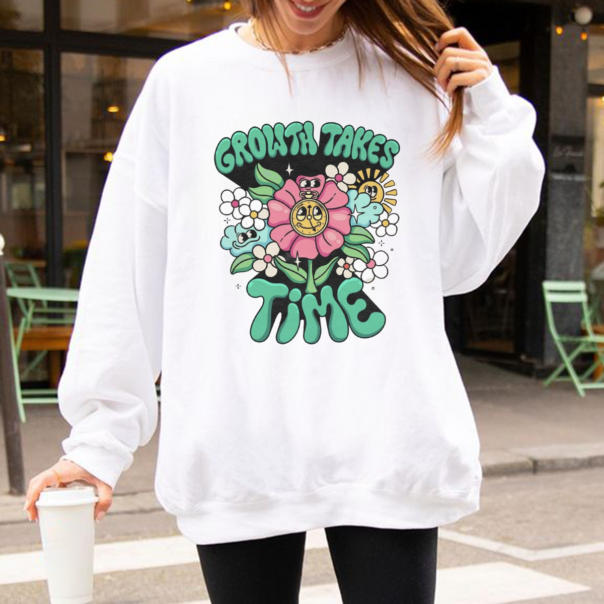 "Growth Takes" And "Time", A Pink Flower, Smiling Face, Sun, Small Flowers And Other Combination Patterns, The Overall Style Has A Retro Hippie And Cartoon Fun, Casual Sports Shirts, Round Neck Sweats