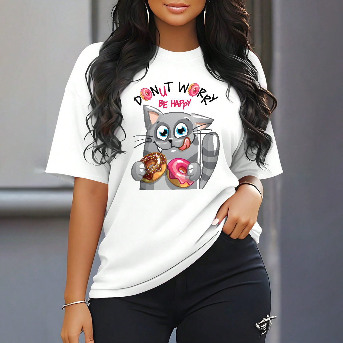 "Donut Work Be Happy", Slogan And A Cartoon Cat Holding Two Donuts, One With Chocolate Frosting And One With Pink Frosting, A Combination Of Casual T-Shirts.