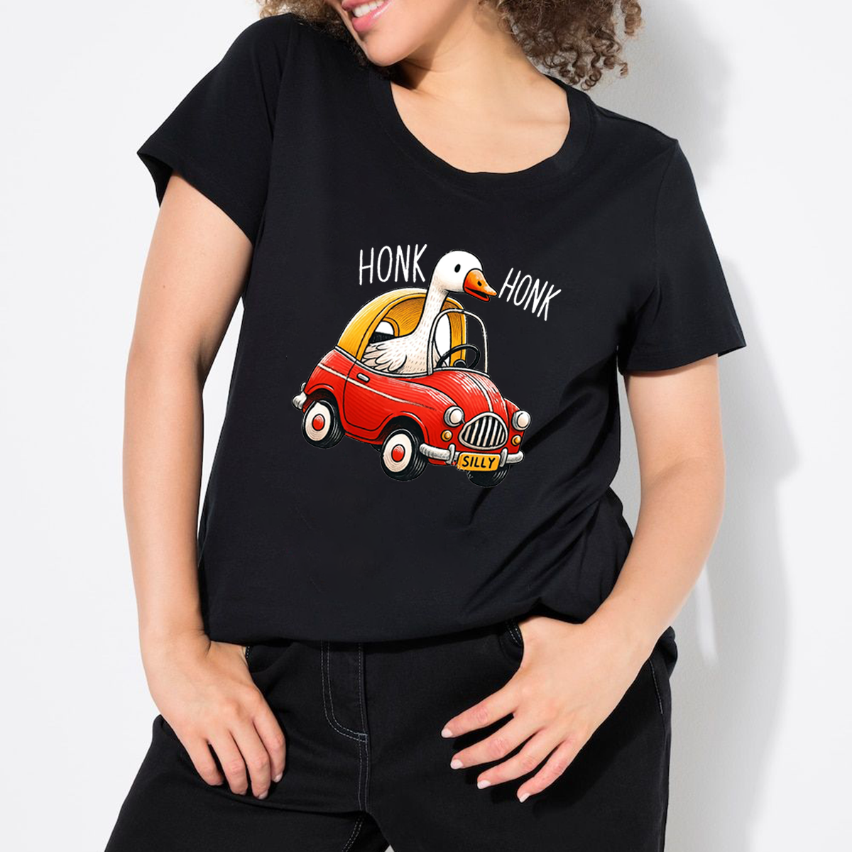 "Honk Honk", Slogan And A Cartoon Illustration Of A Big White Goose Sitting In A Red Car, Combined Pattern, Casual T-Shirt.