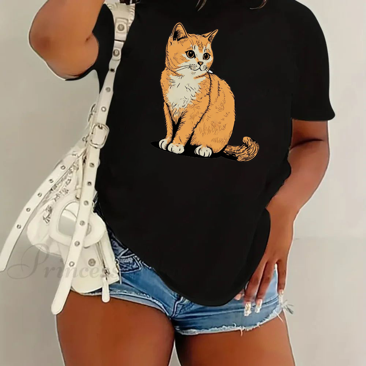 A Casual T-Shirt With A Cartoon Cat Pattern.