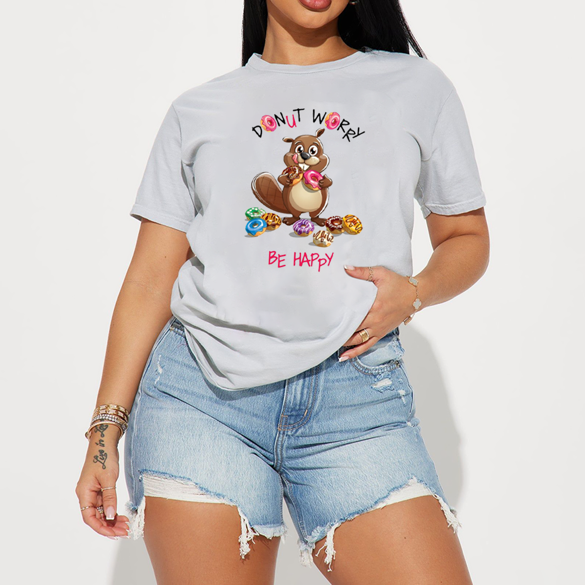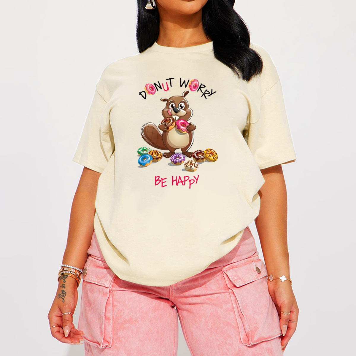 "Donut Worry Be Happy", Slogan And A Cartoon Beaver Holding A Donut In His Hand, Surrounded By Multiple Donuts In Different Colors And Decorations, Casual T-Shirt.