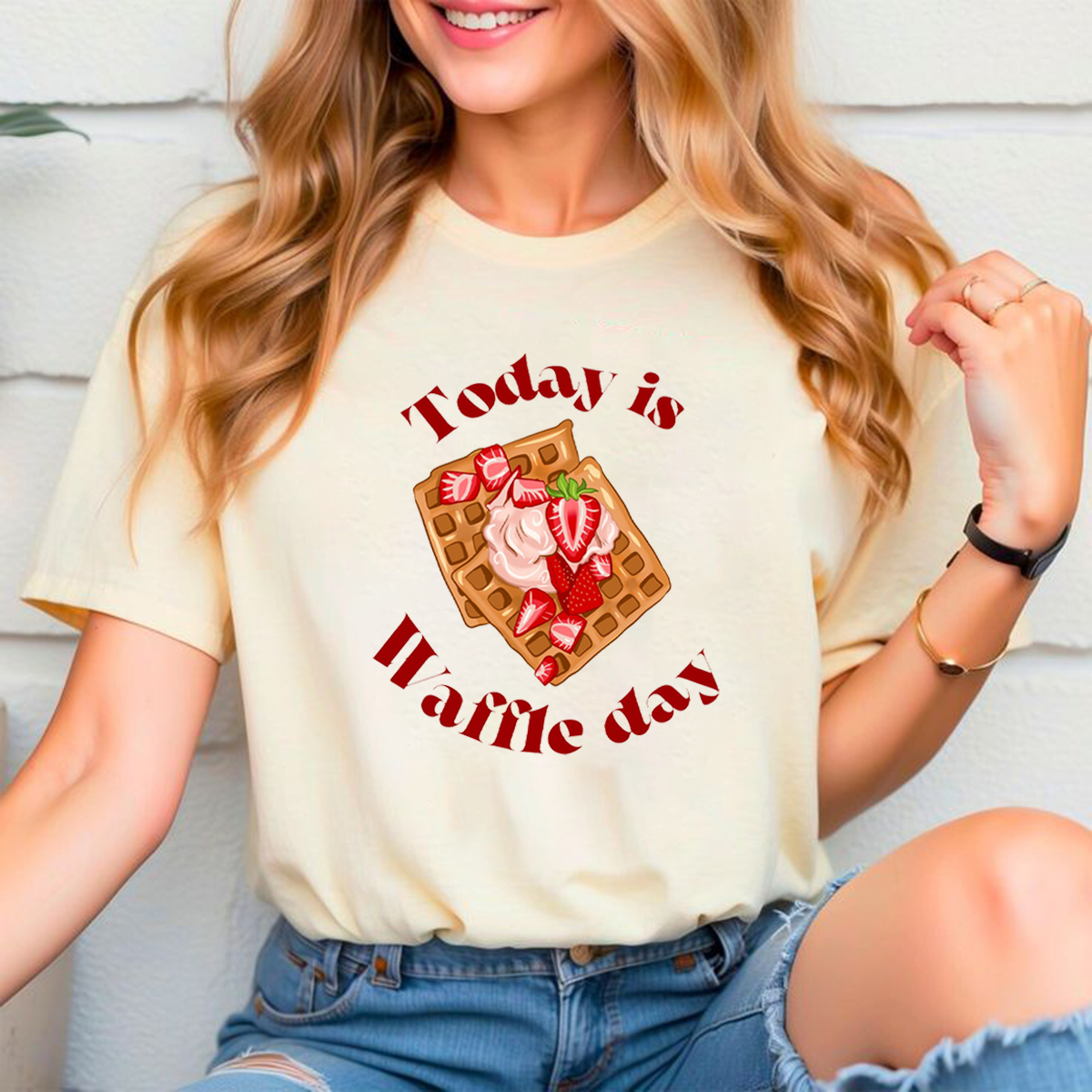 "Today Is Waffle Day", Slogan And A Cartoon Of Two Waffles With Whipped Cream And Strawberry Slices, Casual T-Shirt.