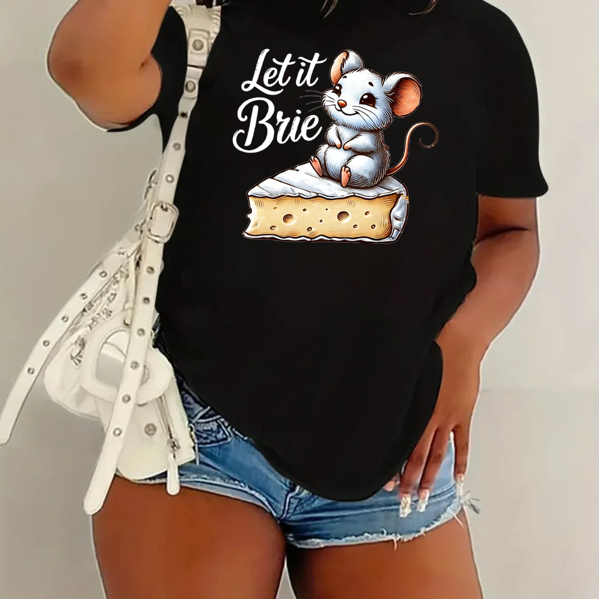 "Let It Brie", Slogan And A Cartoon Illustration Of A Little Mouse Sitting On A Piece Of Cheese, Combined With Graphics, Casual T-Shirt.