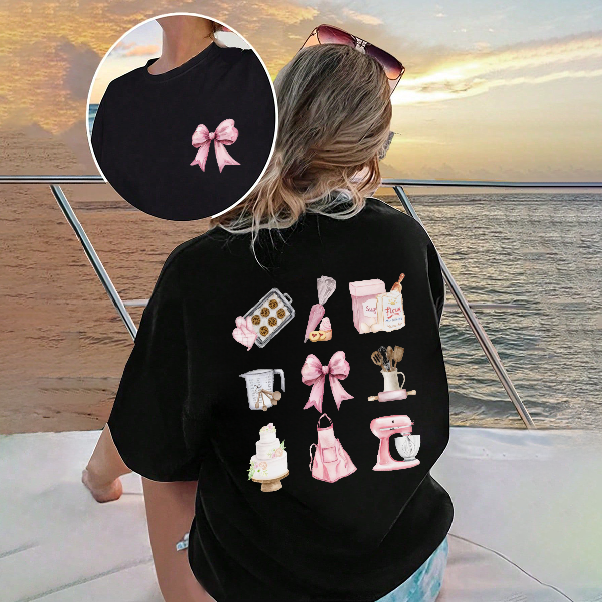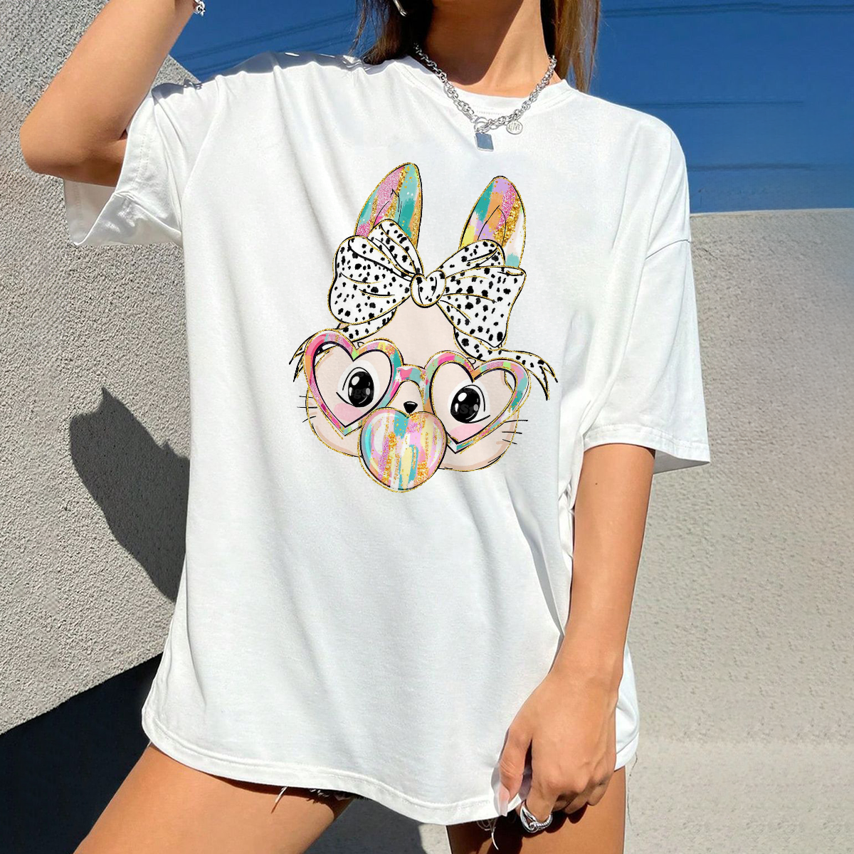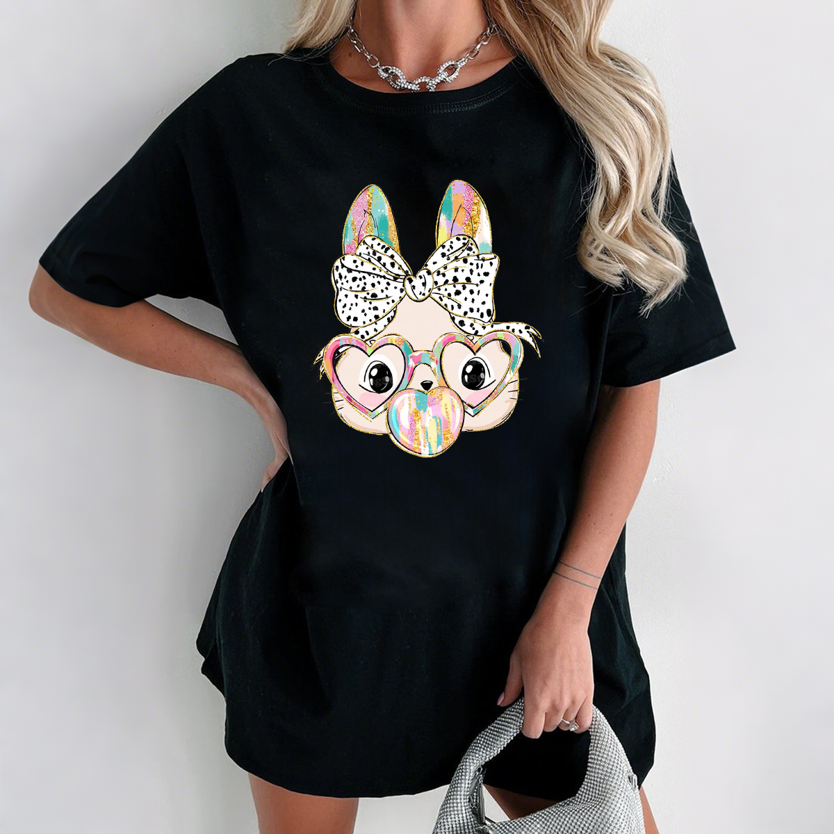 A Cartoon Bunny Ears With A Black And White Polka Dot Bow, Heart-Shaped Glasses, And A Bubble Gum Pattern, And A Casual T-Shirt.
