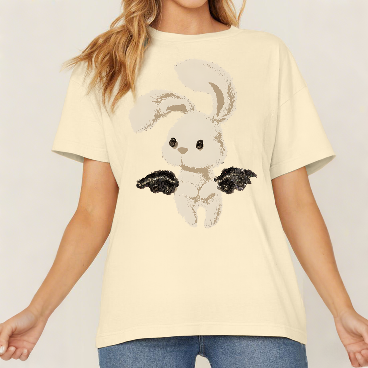 A Cartoon Rabbit With Black Wing Patterns On Both Sides, Cute And Fresh Style, Loose And Casual T-Shirt.