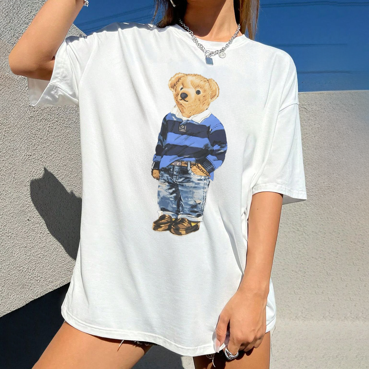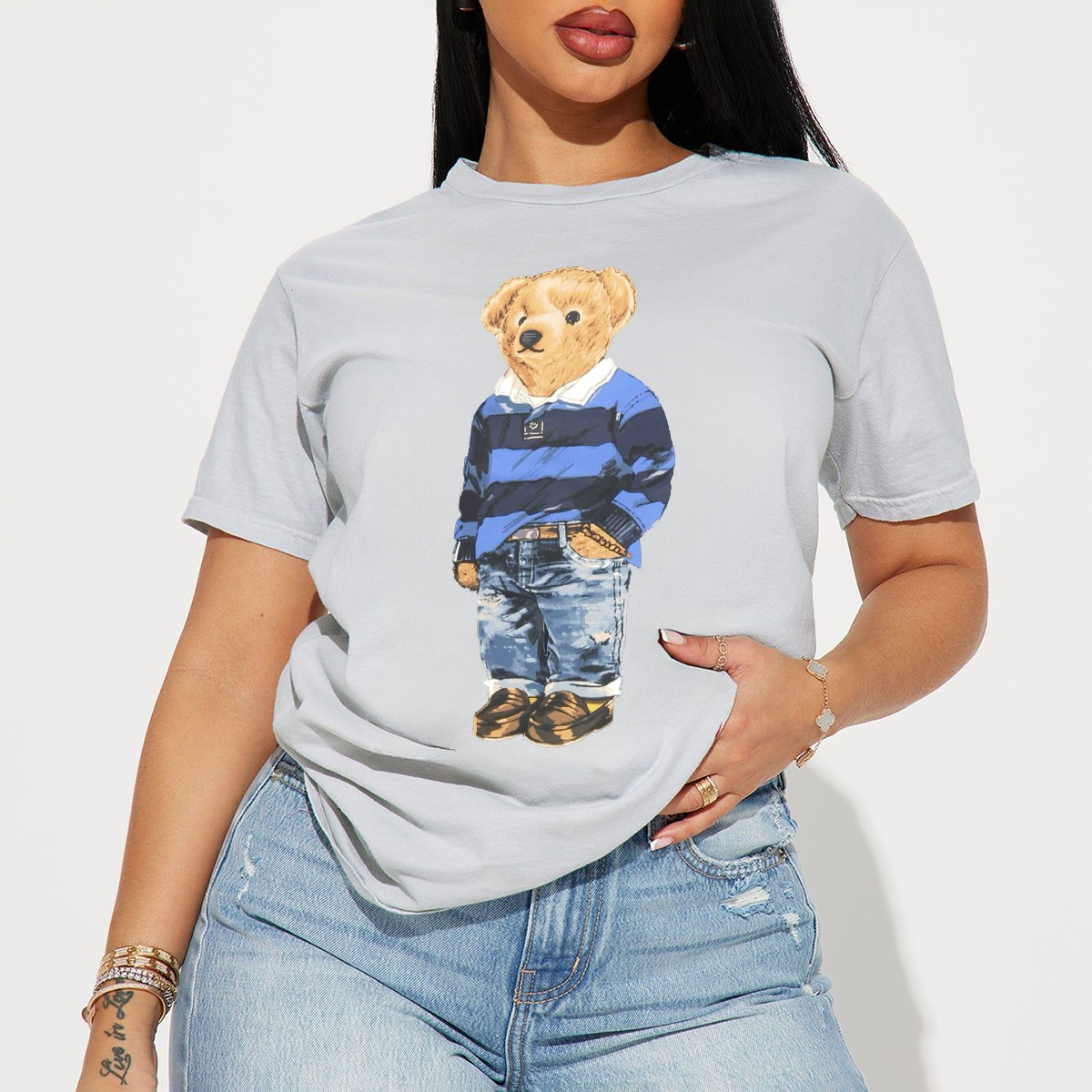 A Cartoon Bear Wearing A Blue And Black Striped Top, Left Hand In Pocket, Ripped Jeans And Brown Shoes, A Cute Casual T-Shirt.