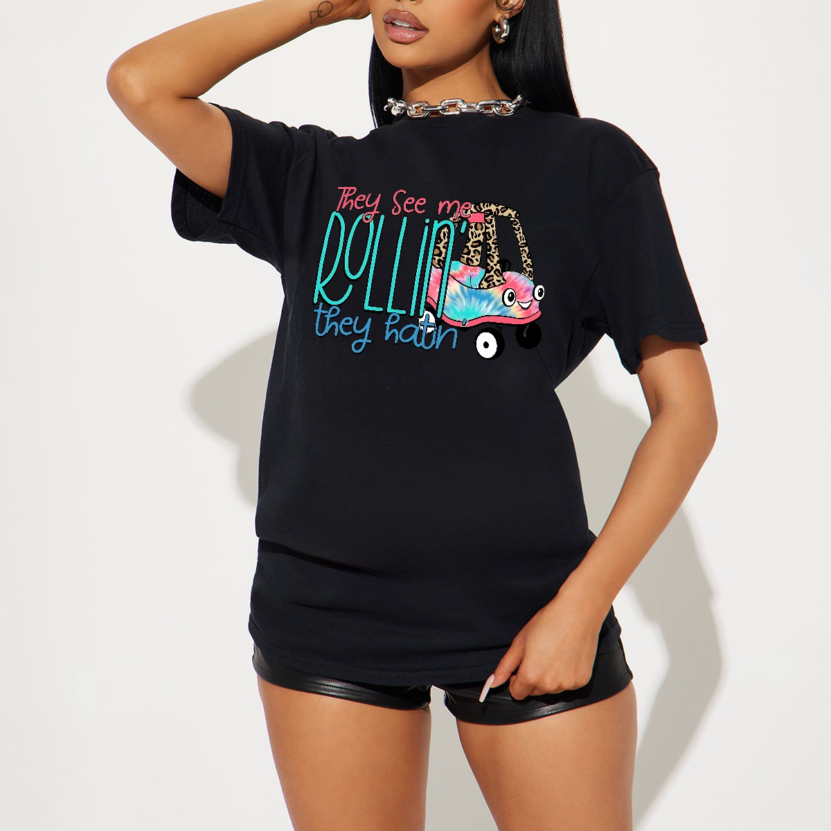 "They See Me Rollin They Hatin", Slogan And A Cartoon Car With Leopard Print Decoration, The Body Of The Car Is Blue And Pink Gradient Color, Adding A Sense Of Fun, Casual T-Shirt.