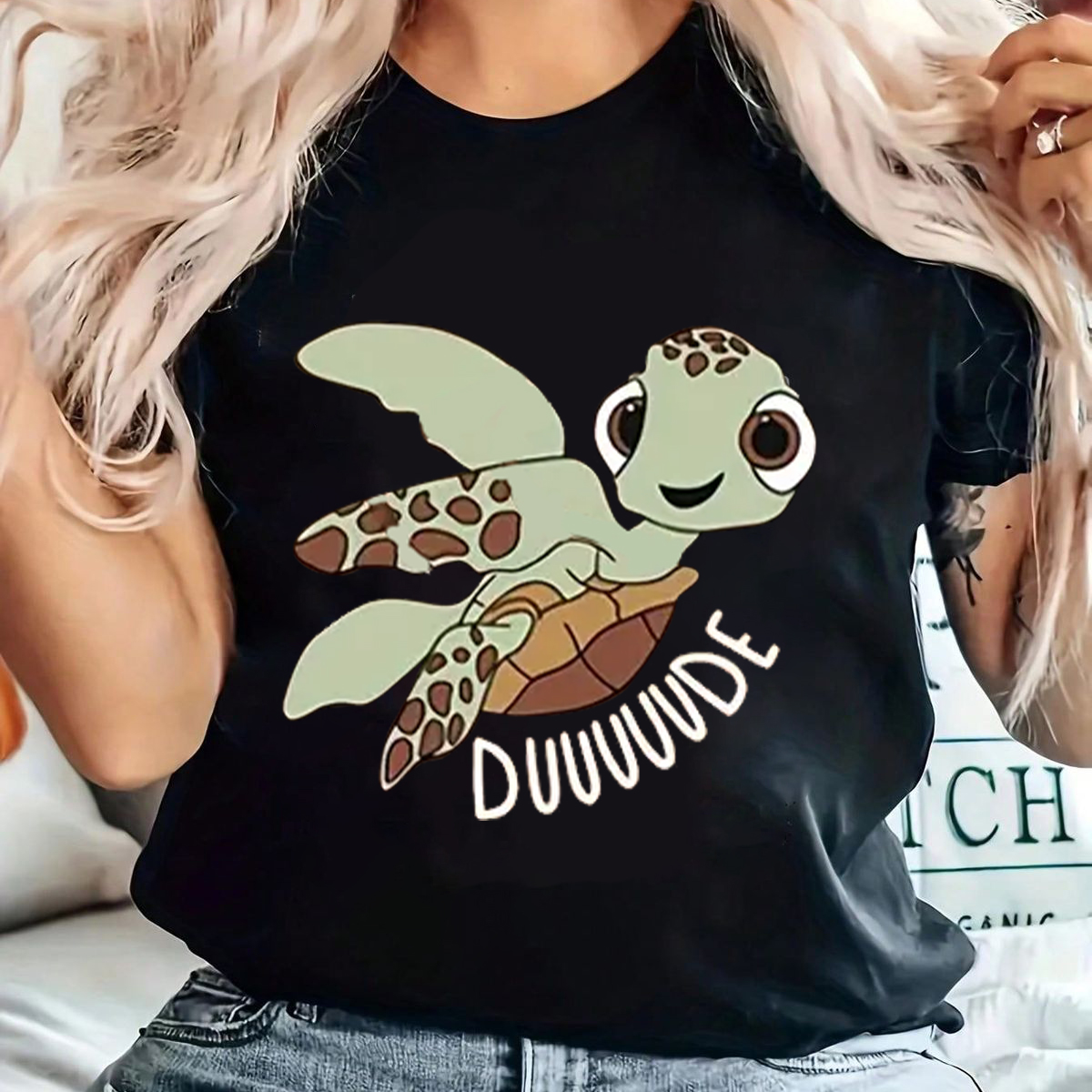 "Duuuude", A Slogan And A Cartoon Turtle Pattern, Cute, Fresh Style, Casual T-Shirt.