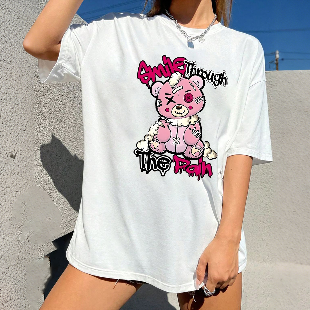 "Smile Through The Pain", Slogan And A Pink Cartoon Bear Pattern, Casual T-Shirt.
