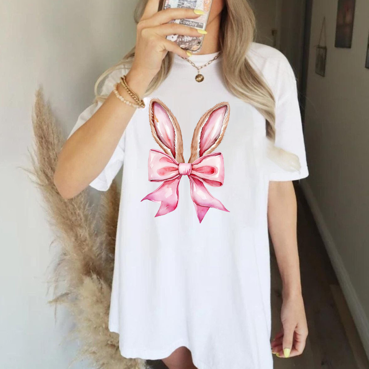 Cartoon Style Bunny Ears Pattern, The Ears Are Black And White Stripes, Tied With A Golden Bow With A Floral Pattern, And A Vase Covered With Pink Flowers, A Casual T-Shirt.