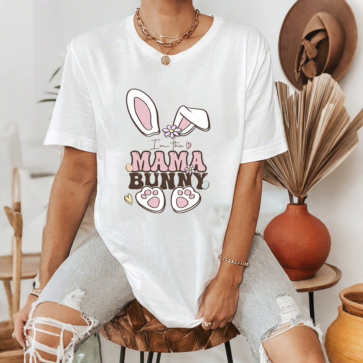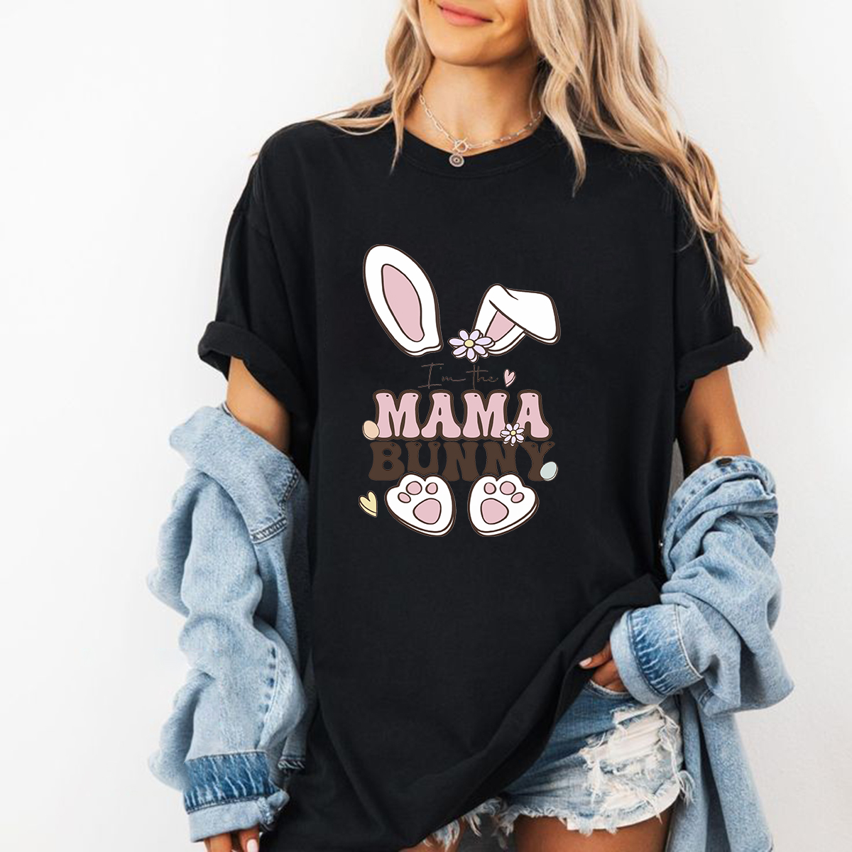 "I'M The Mama Bunny", Cartoon Bunny Ears, Flowers, Bunny Paw Prints, Casual T-Shirt.