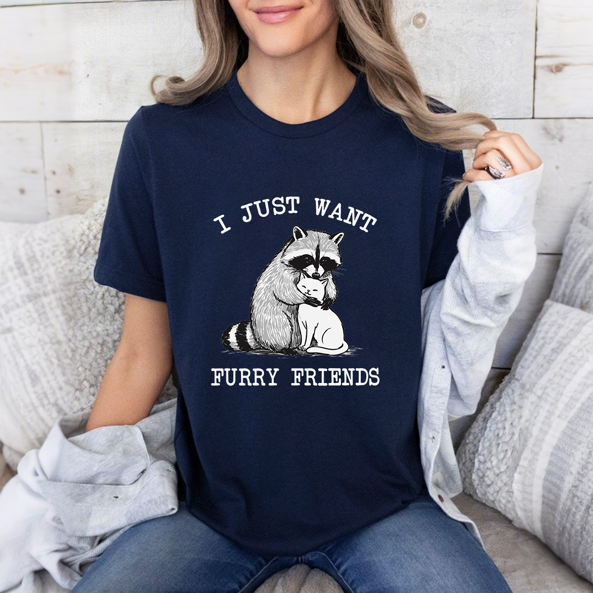 "I Just Want" "Furry Friends", Slogan And A Cartoon Raccoon Hugging A Cat Pattern, Casual T-Shirt.