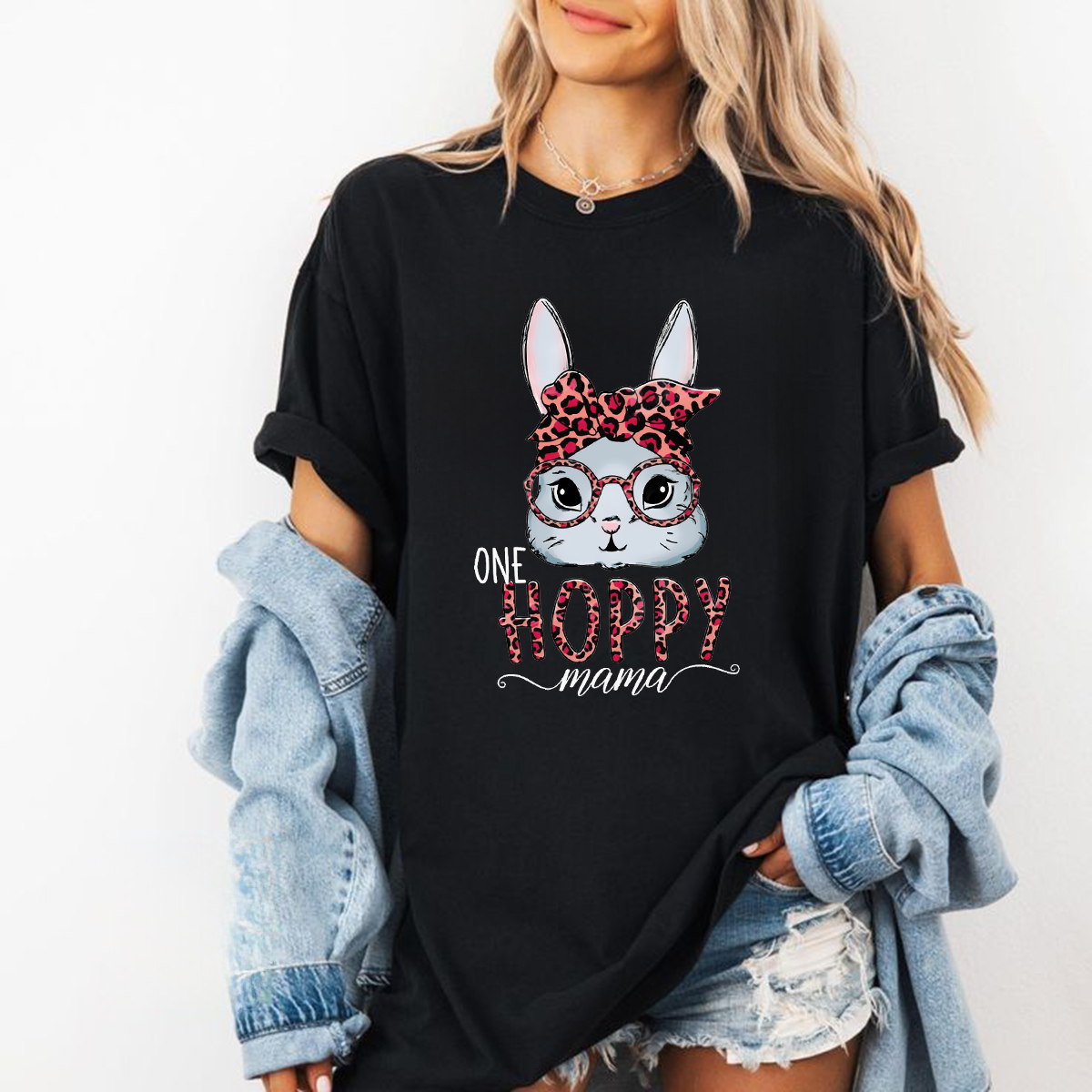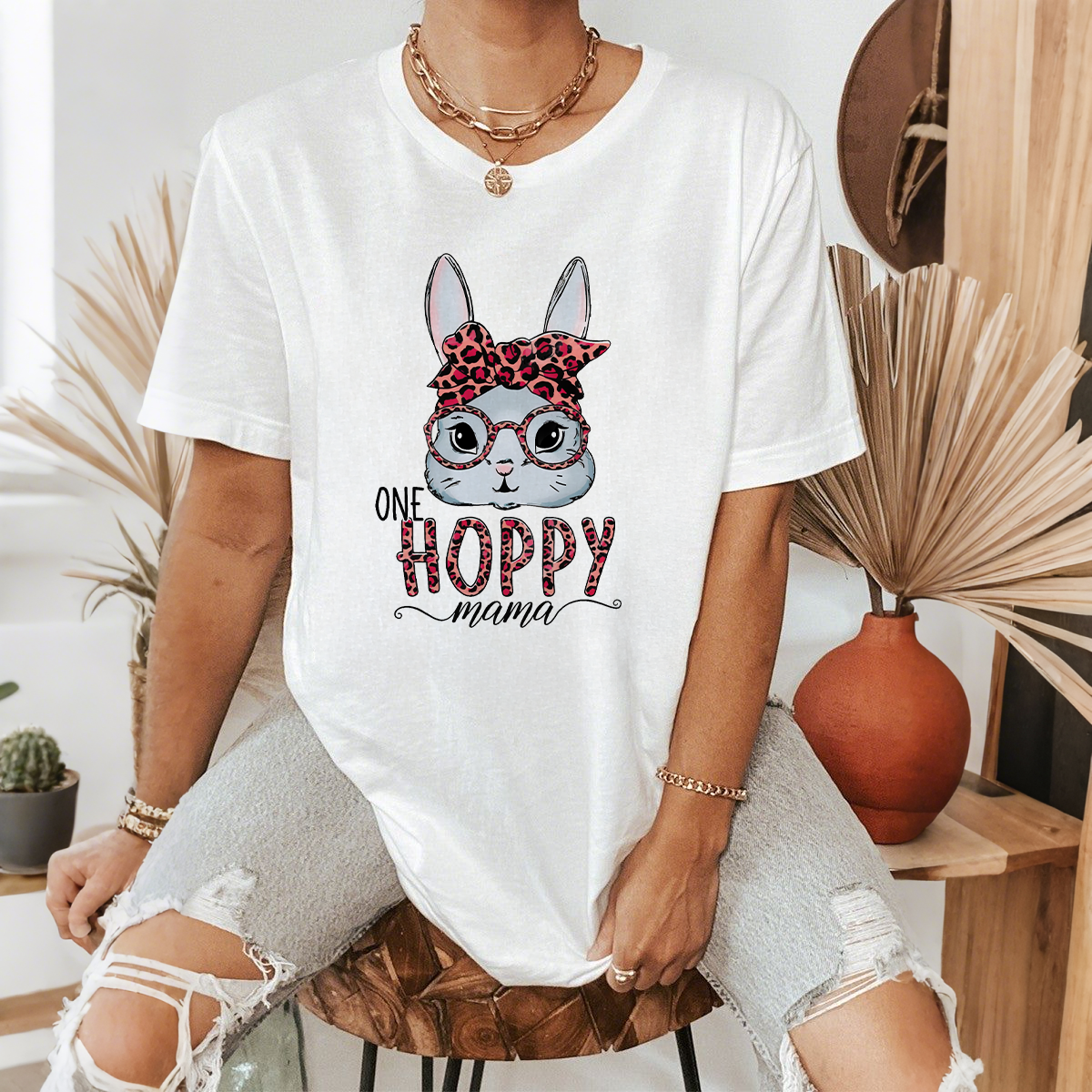 "One Hoppy Mama", The Slogan And A Cartoon Bunny Pattern, The Bunny Wearing A Leopard Print Headscarf And Glasses, Looks Very Playful, Casual T-Shirt.