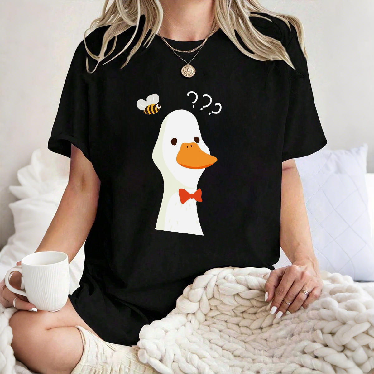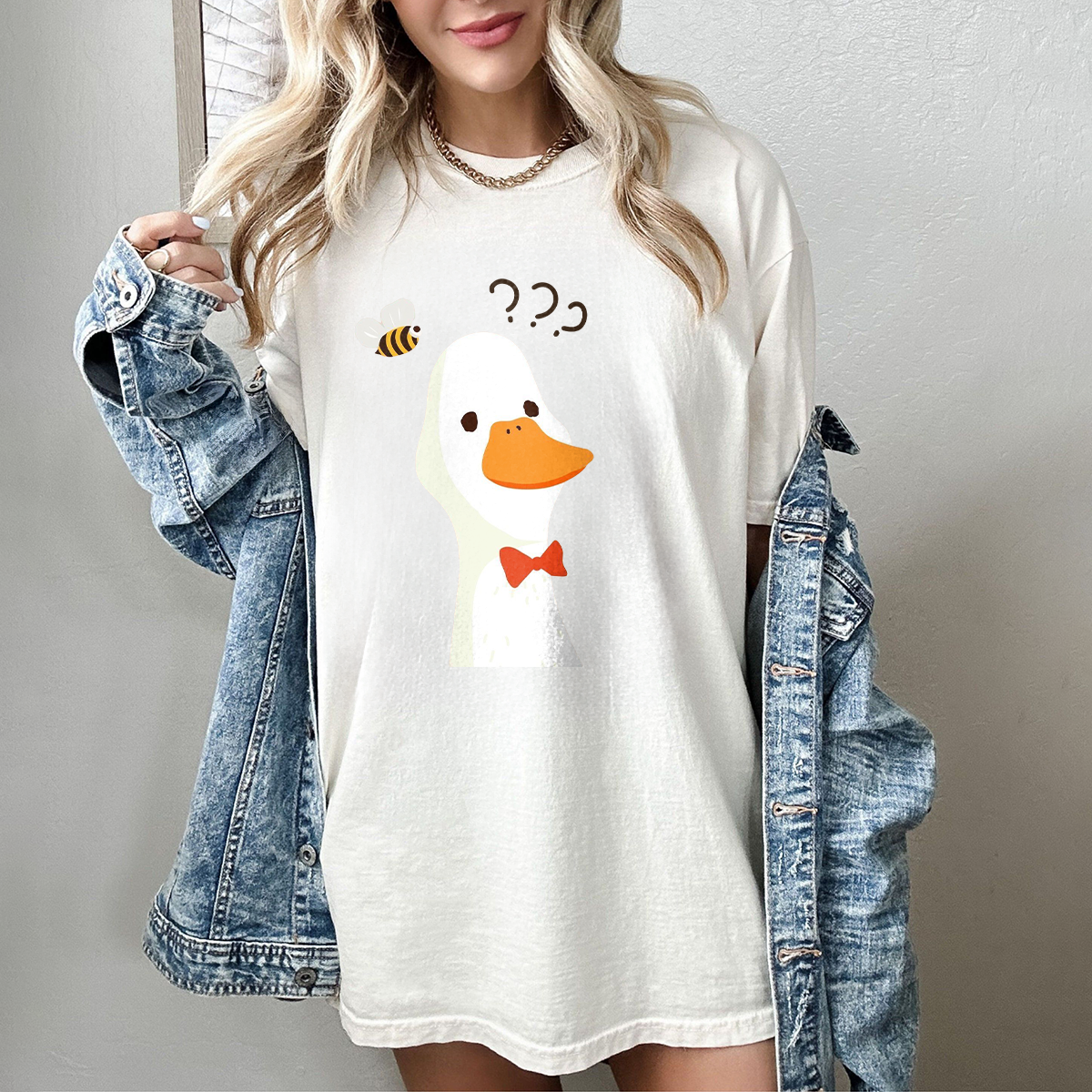 A Cartoon Duck Head Wearing A Bow Tie And Honey Pattern, Three Question Marks, Cute And Playful, Casual T-Shirt.