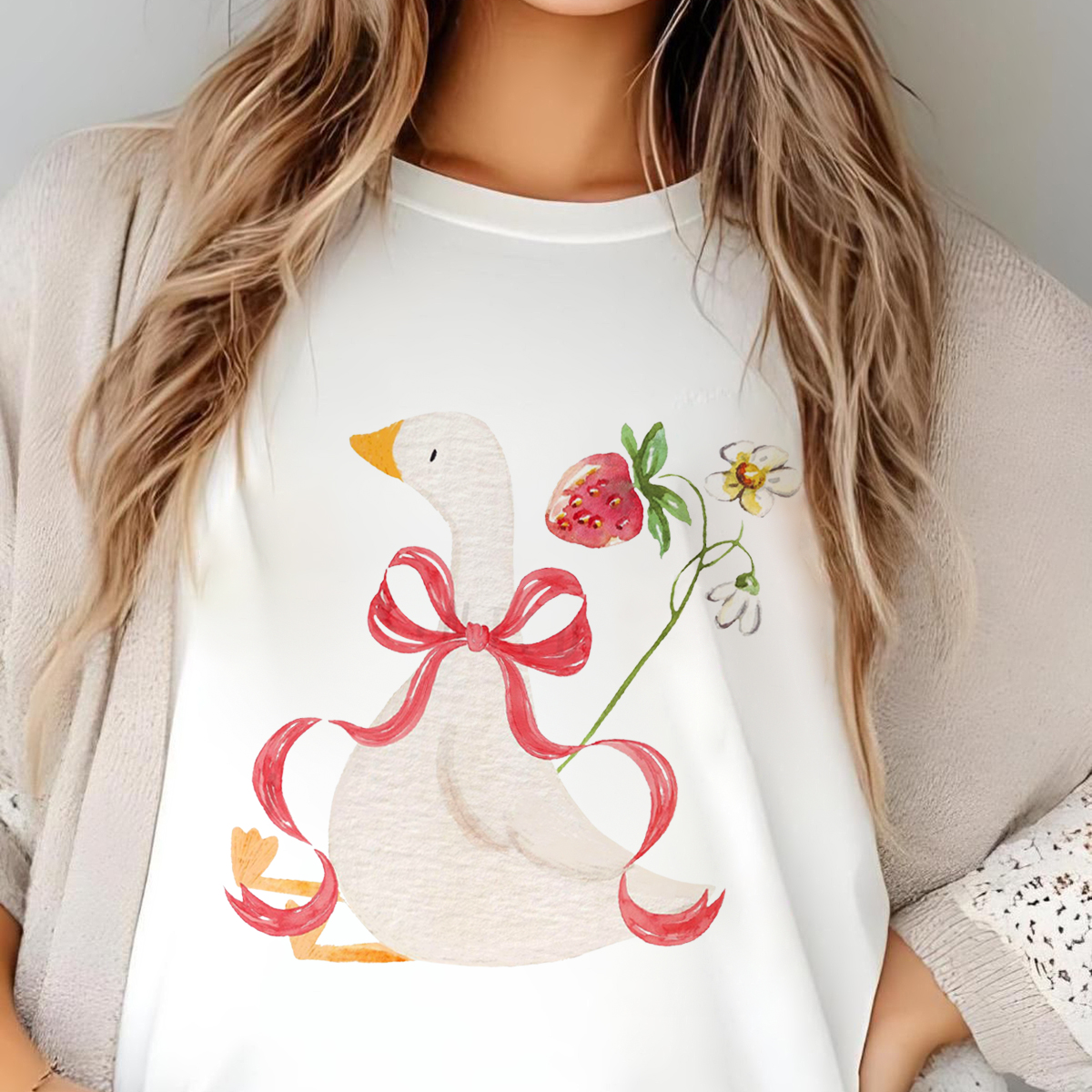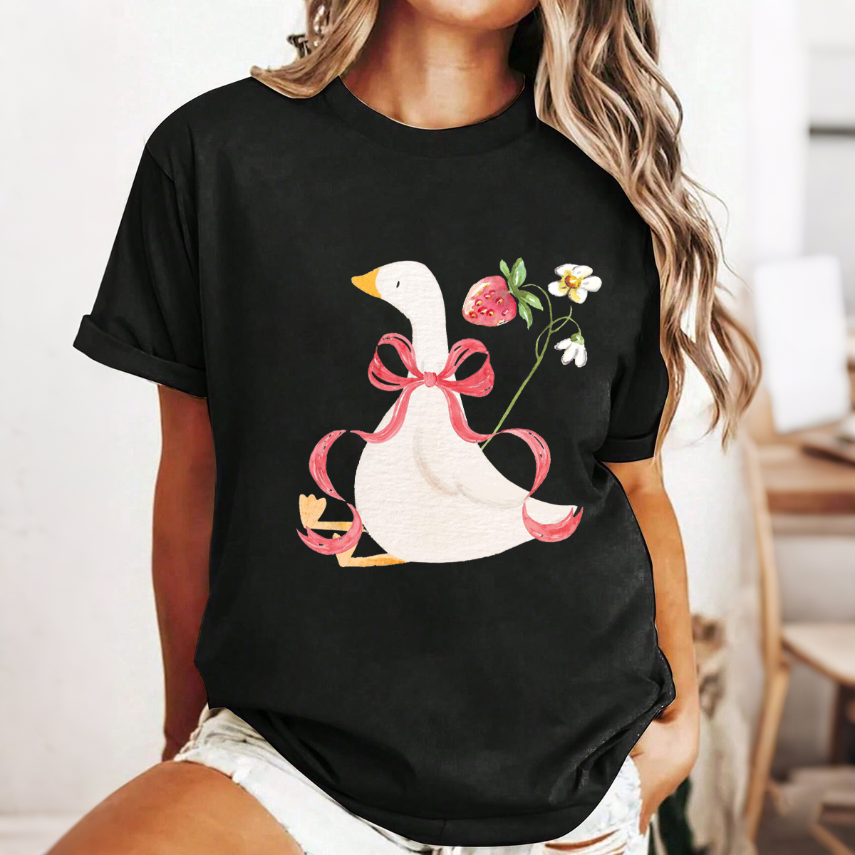 A Cartoon White Goose Pattern With A Pink Ribbon Tied Around Its Body. One End Of The Ribbon Is Connected To A Strawberry And A Few White Flowers. This Is A Casual T-Shirt.