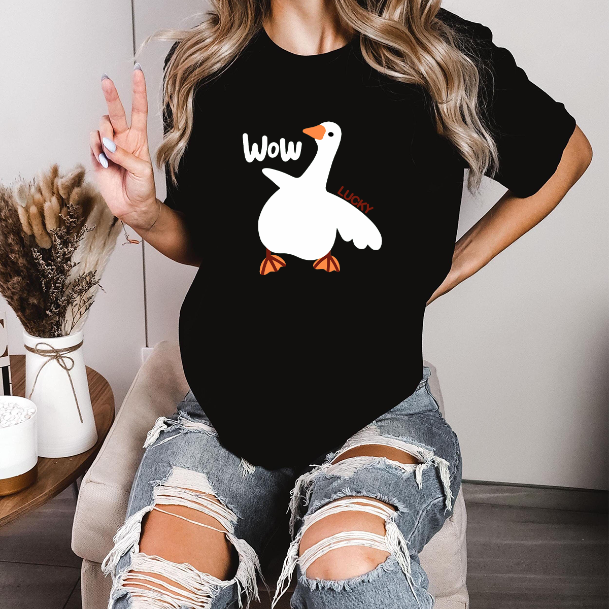 "Wow" "Lucky", Slogan And A White Cartoon Goose Pattern, Casual T-Shirt.