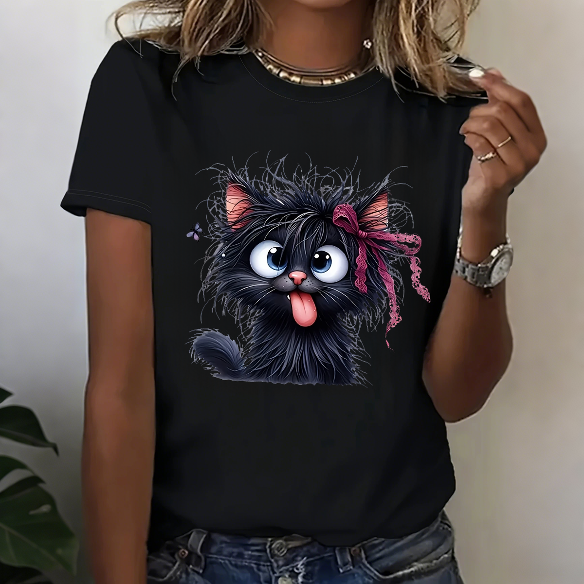 Women's Pink Cartoon Cat With Bow T-Shirt