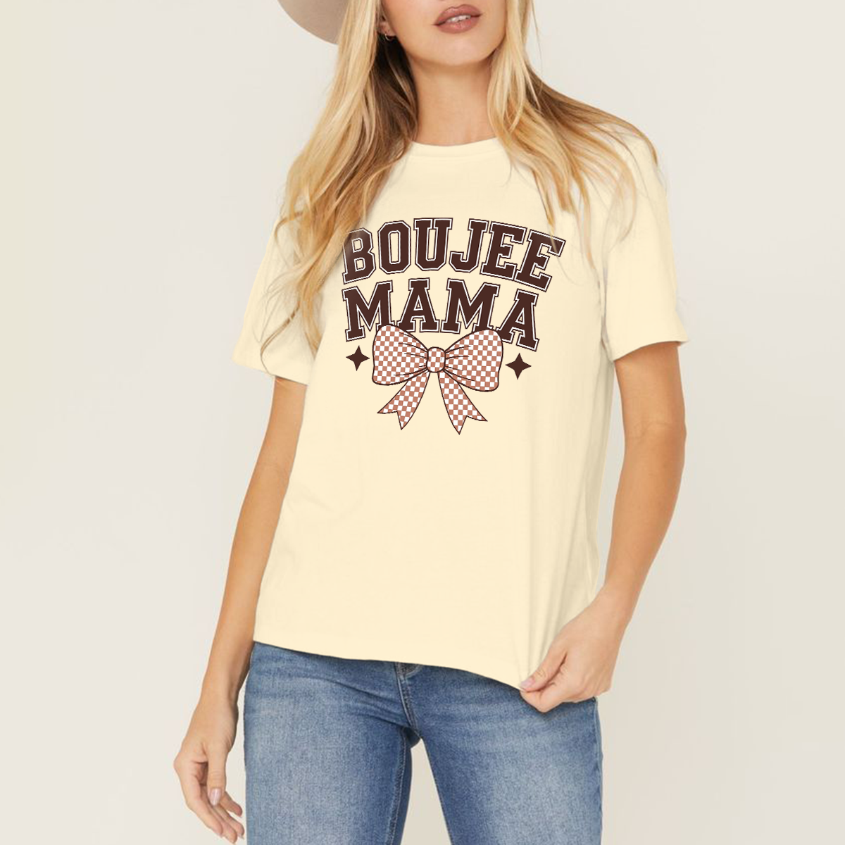 "Boujee Mama", Slogan And A Checkered Pattern Of Bows And Stars, Casual T-Shirt.