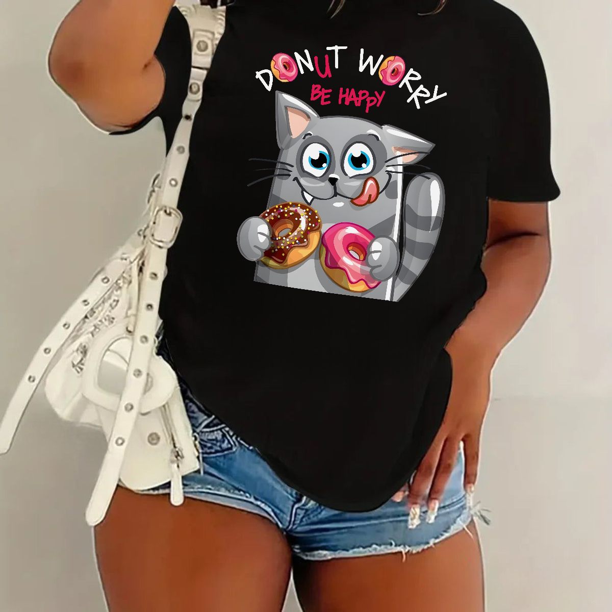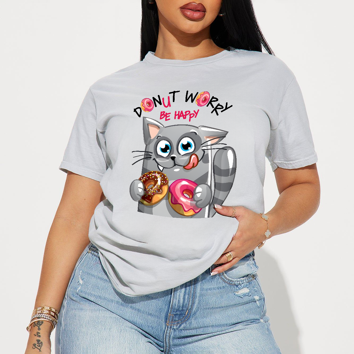"Donut Work Be Happy", Slogan And A Cartoon Cat Holding Two Donuts, One With Chocolate Frosting And One With Pink Frosting, A Combination Of Casual T-Shirts.