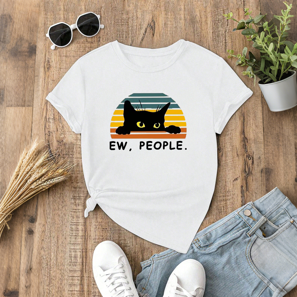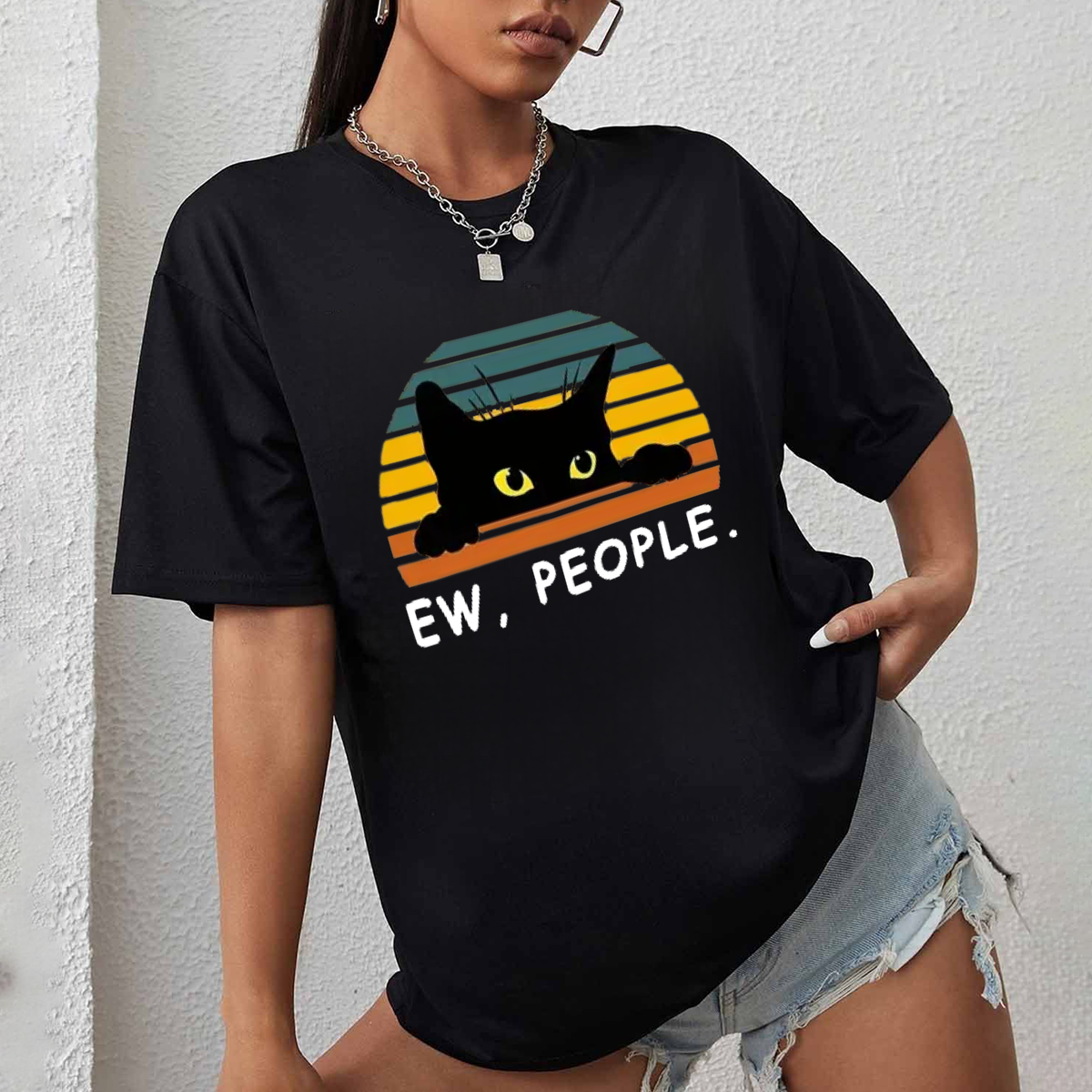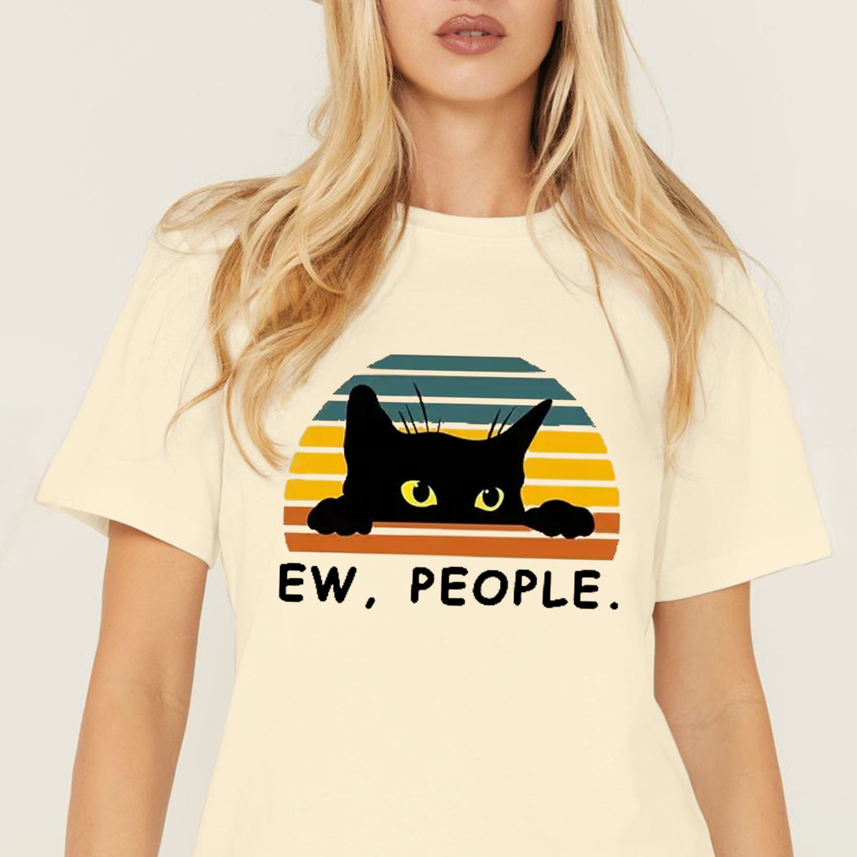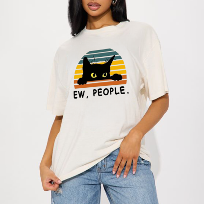 "Ew, People." And A Cartoon Pattern Of A Black Cat Poking Its Head Out, With A Sunset Pattern Made Up Of Colorful Stripes In The Background. Casual T-Shirt.