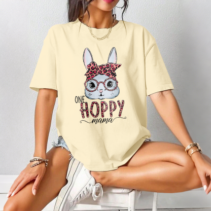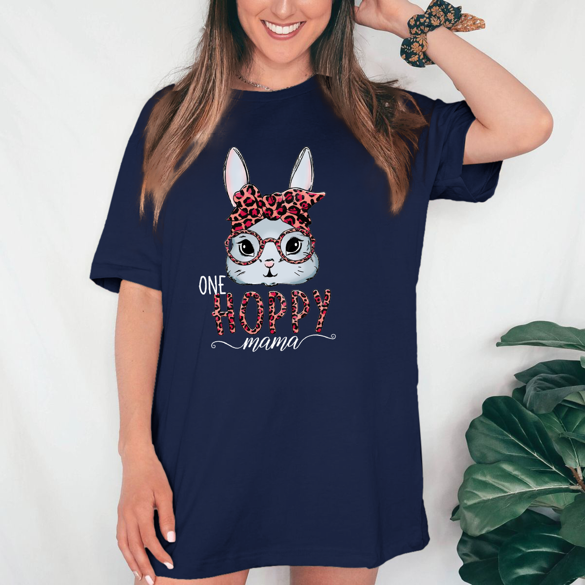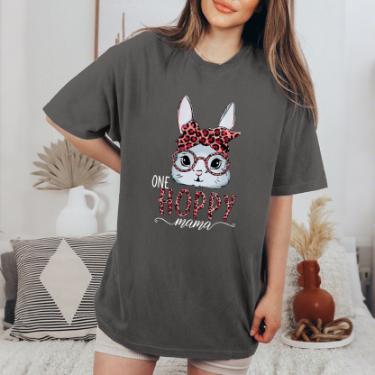 "One Hoppy Mama", The Slogan And A Cartoon Bunny Pattern, The Bunny Wearing A Leopard Print Headscarf And Glasses, Looks Very Playful, Casual T-Shirt.