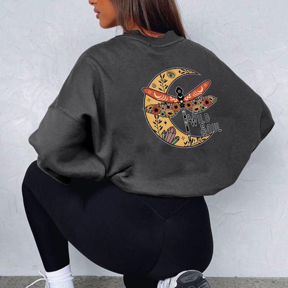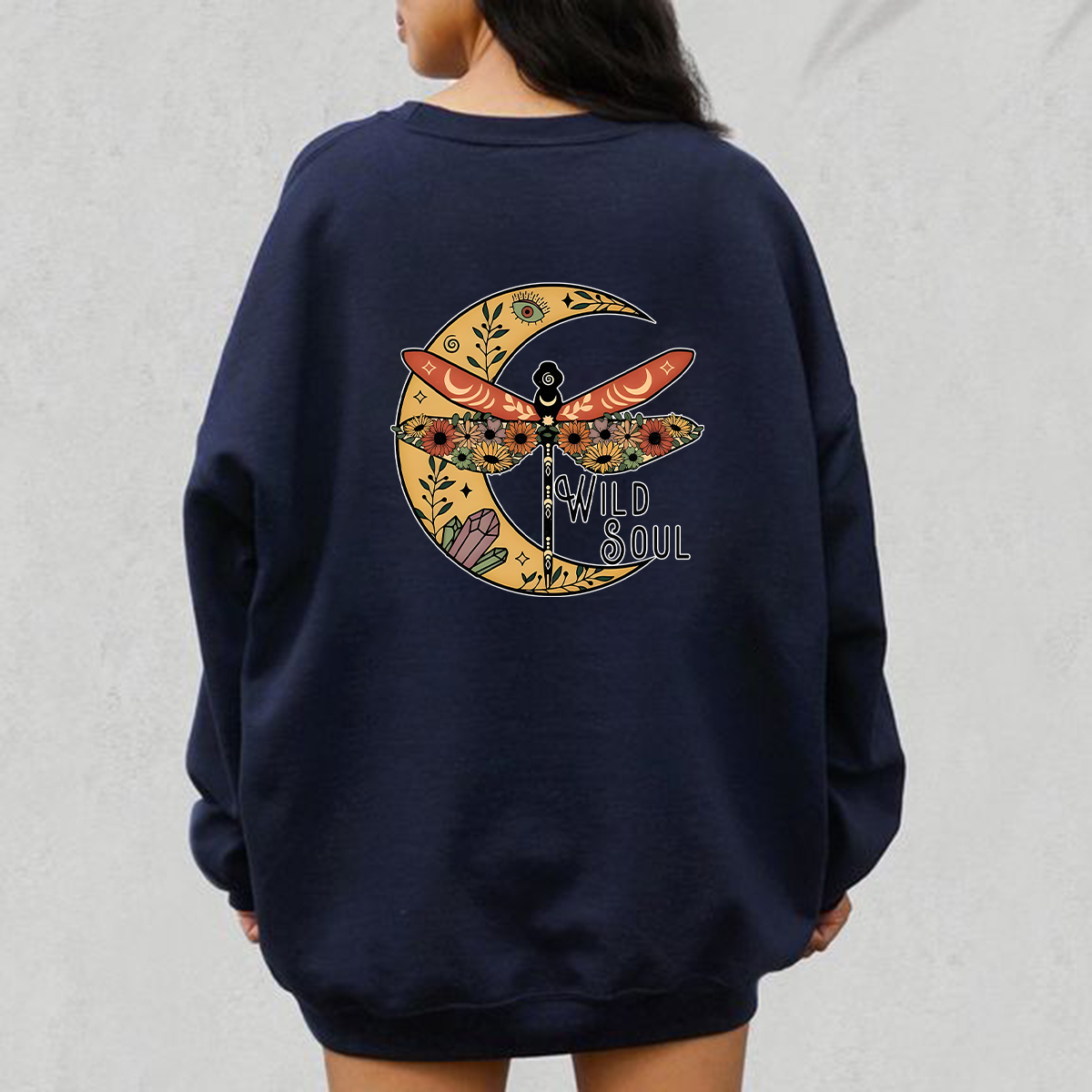"Wild Soul", Slogan And An Orange-Red Dragonfly With Patterns Resting On A Yellow Crescent, Floral And Crystal Combination Patterns, Casual Sweatshirts, Crew Neck Sweatshirts.