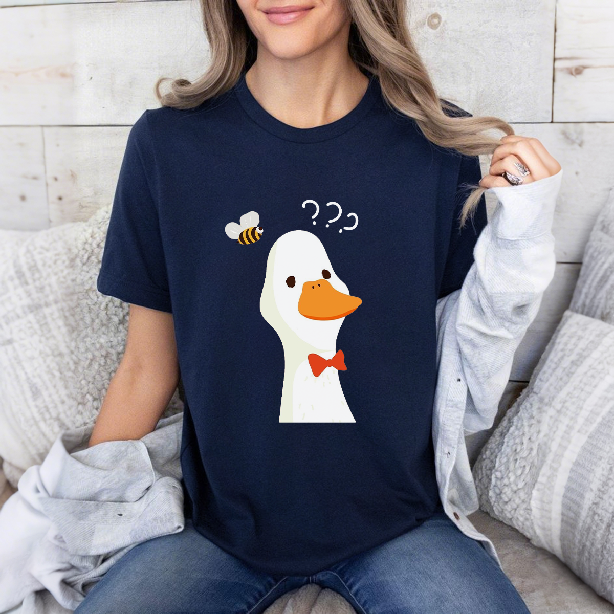 A Cartoon Duck Head Wearing A Bow Tie And Honey Pattern, Three Question Marks, Cute And Playful, Casual T-Shirt.