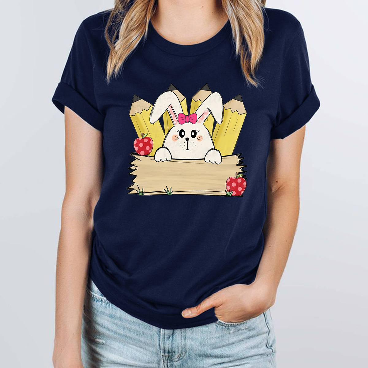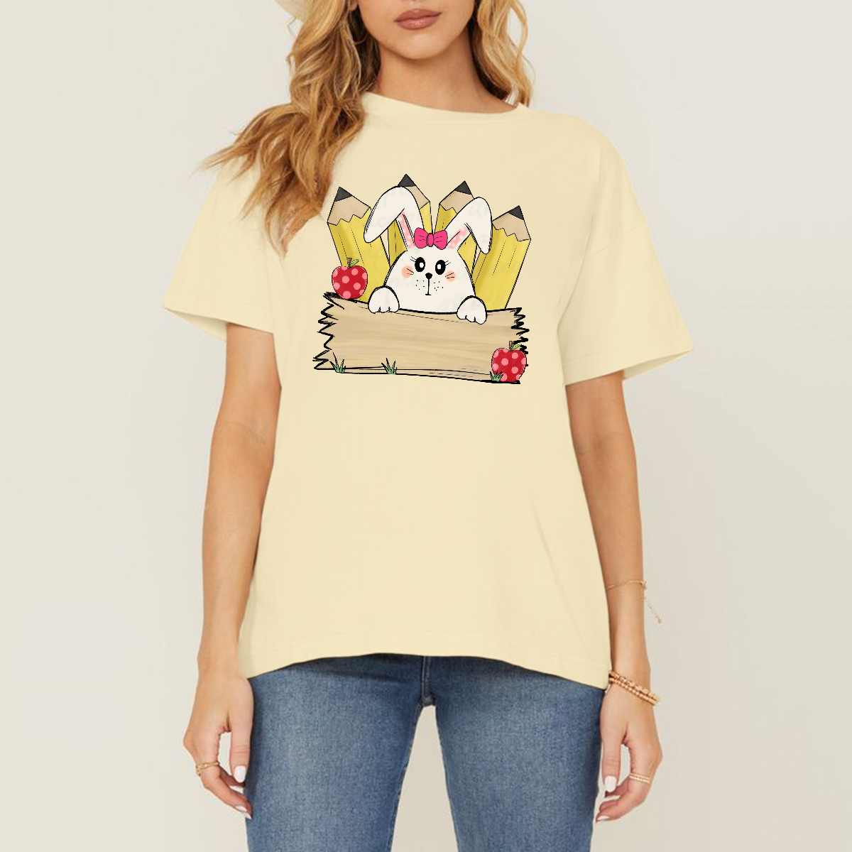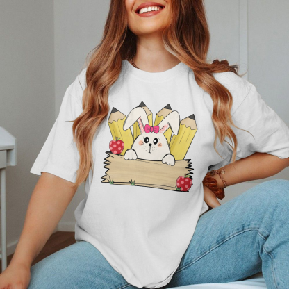A Cartoon White Rabbit Wearing A Pink Bow Holding A Blank Board, A Yellow Pencil And A Red Strawberry With White Dots, A Childlike, Fresh Style, Casual T-Shirt