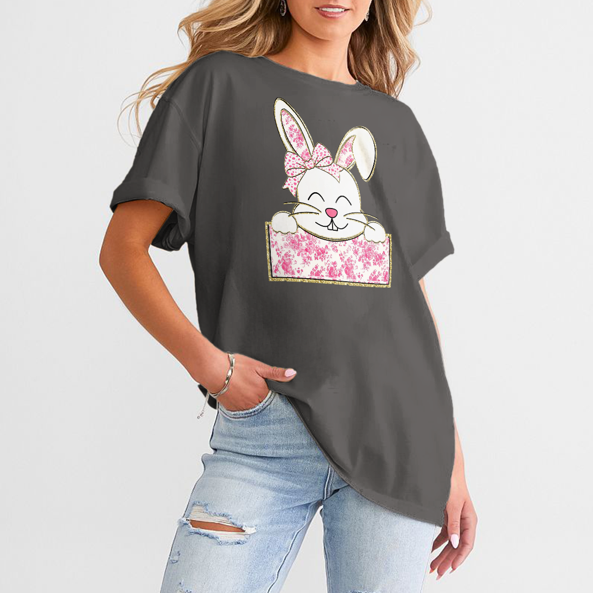 A Cute Cartoon Rabbit Pattern, The Rabbit Is Wearing A Pink Floral Bow, With Its Two Front Paws Resting On A Pink Floral Sign, Casual T-Shirt