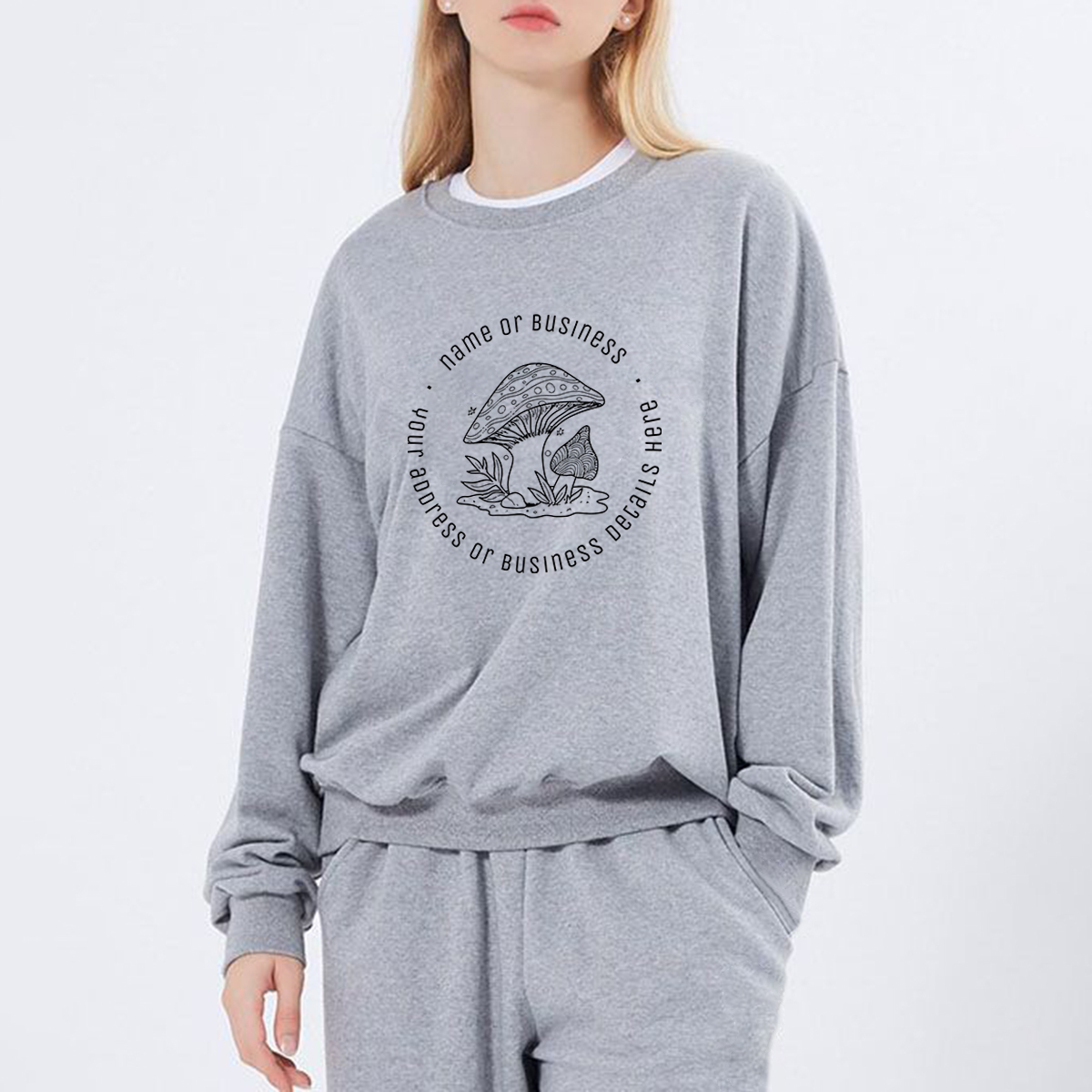 A Round-Neck Sweatshirt With An Illustration Of A Mushroom Surrounded By The Slogans "Name Or Business" And "Details Here".
