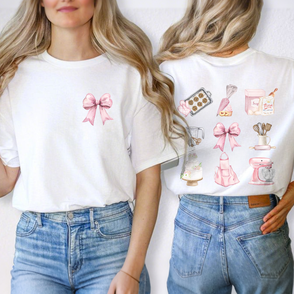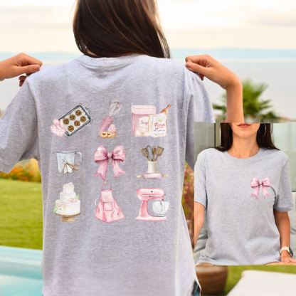 A Set Of Baking Cartoon Patterns, Including Baking Trays And Biscuits, Piping Bags, Flour Bags, Measuring Cups, Mixers, Cakes, Aprons, Egg Beaters, Etc., And Pink Bow Decorations. The Overall Color Is