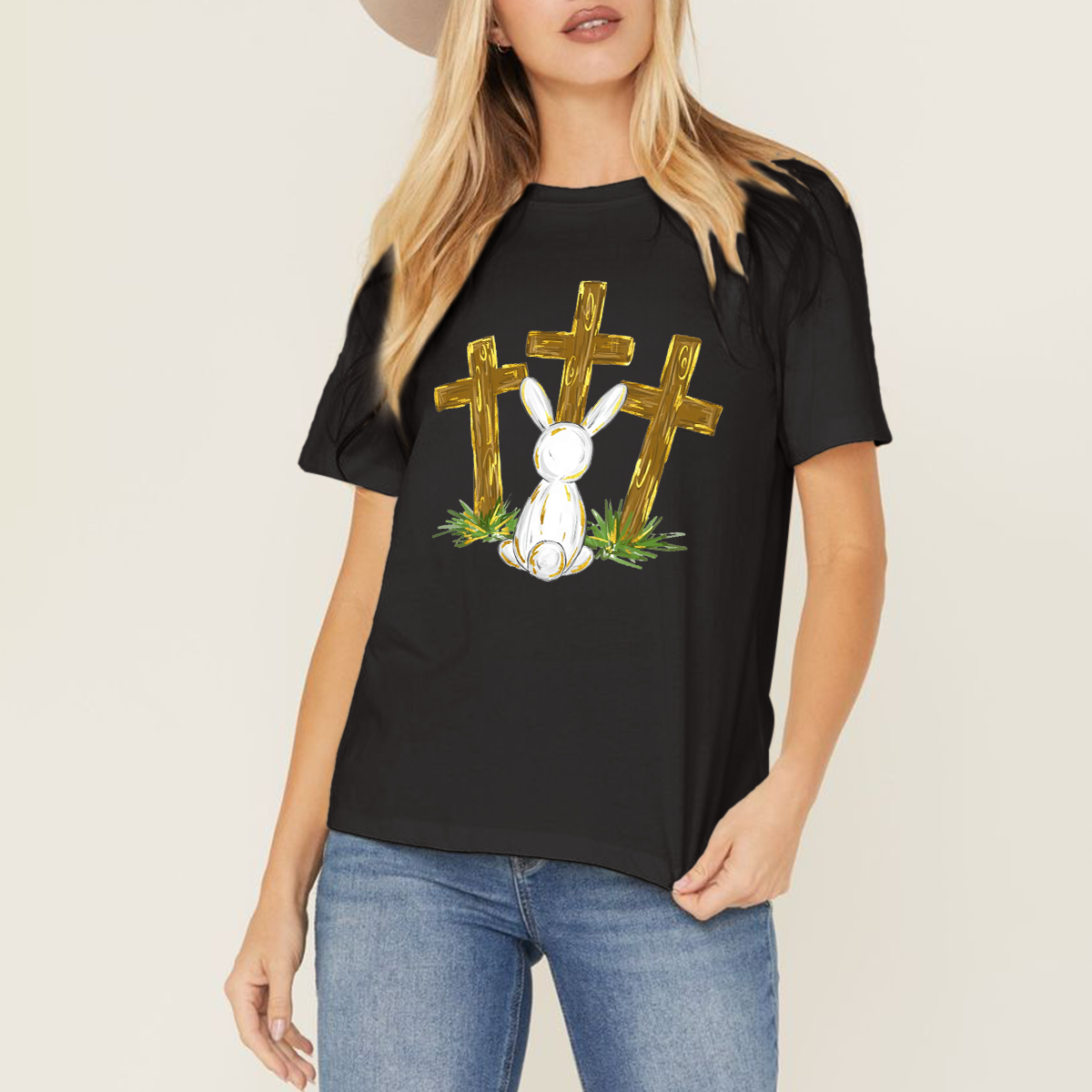 Cartoon Bunny And Three Golden Crosses Combination Pattern, Easter And Christian Elements, Loose, Simple, Casual T-Shirt.