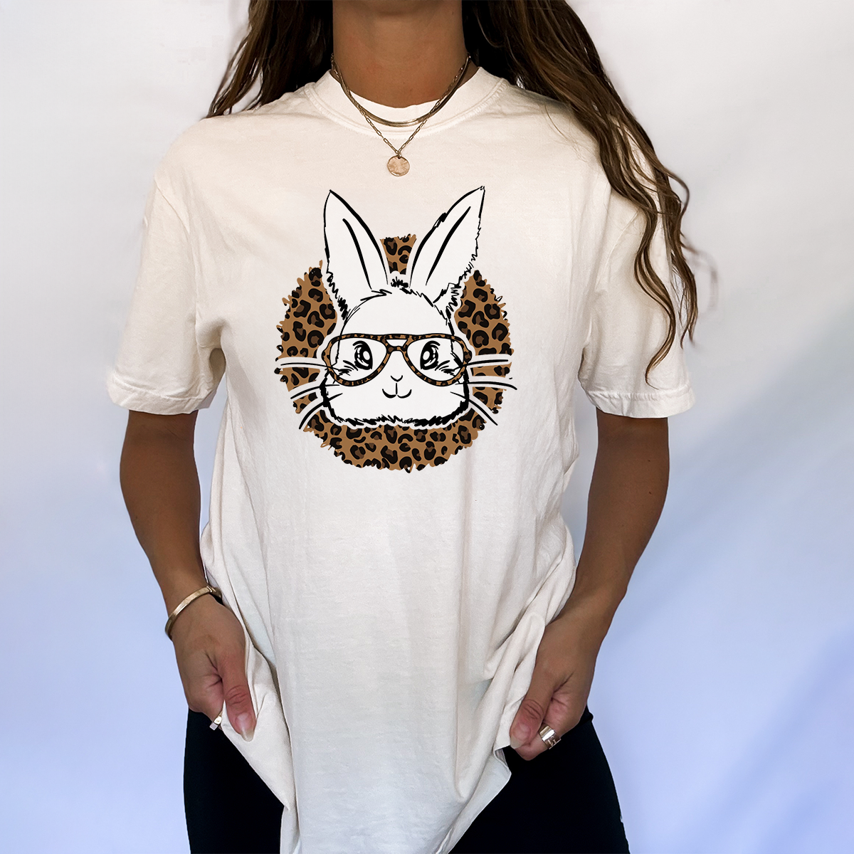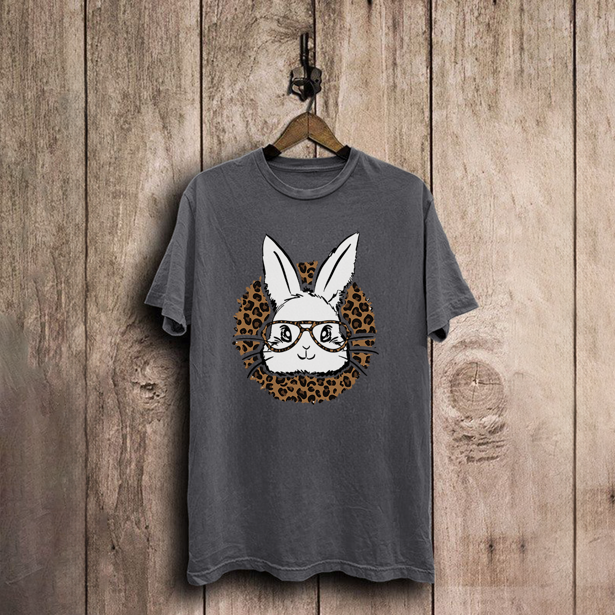 Cartoon Bunny Wearing Leopard Print Glasses And Leopard Print Background Combination Pattern, Loose Fitting T-Shirt.