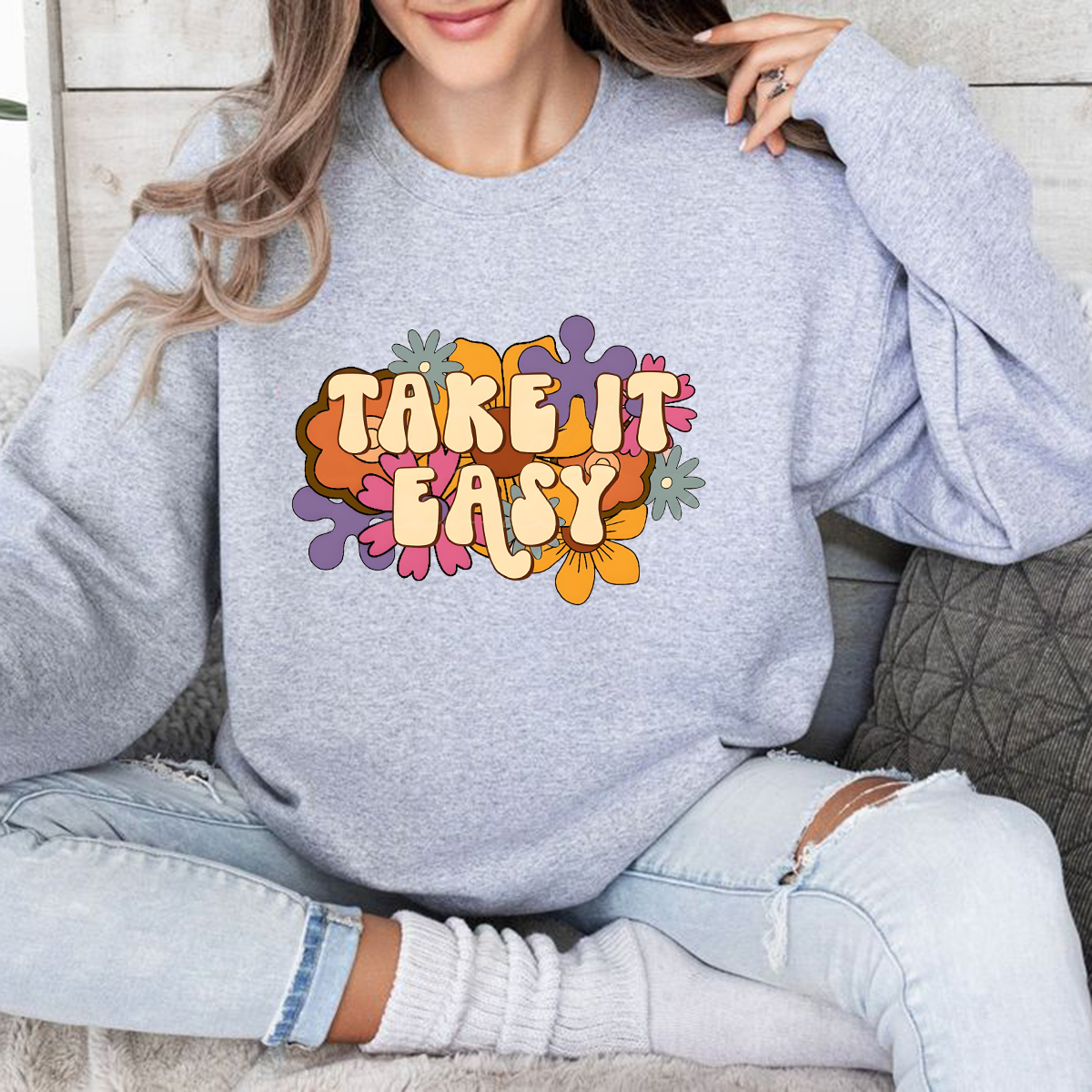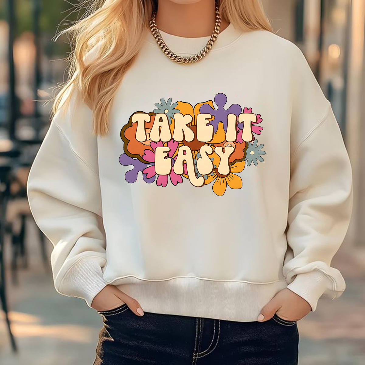 Crewneck Sweatshirt With 'Take It Easy' Slogan And Floral Illustration
