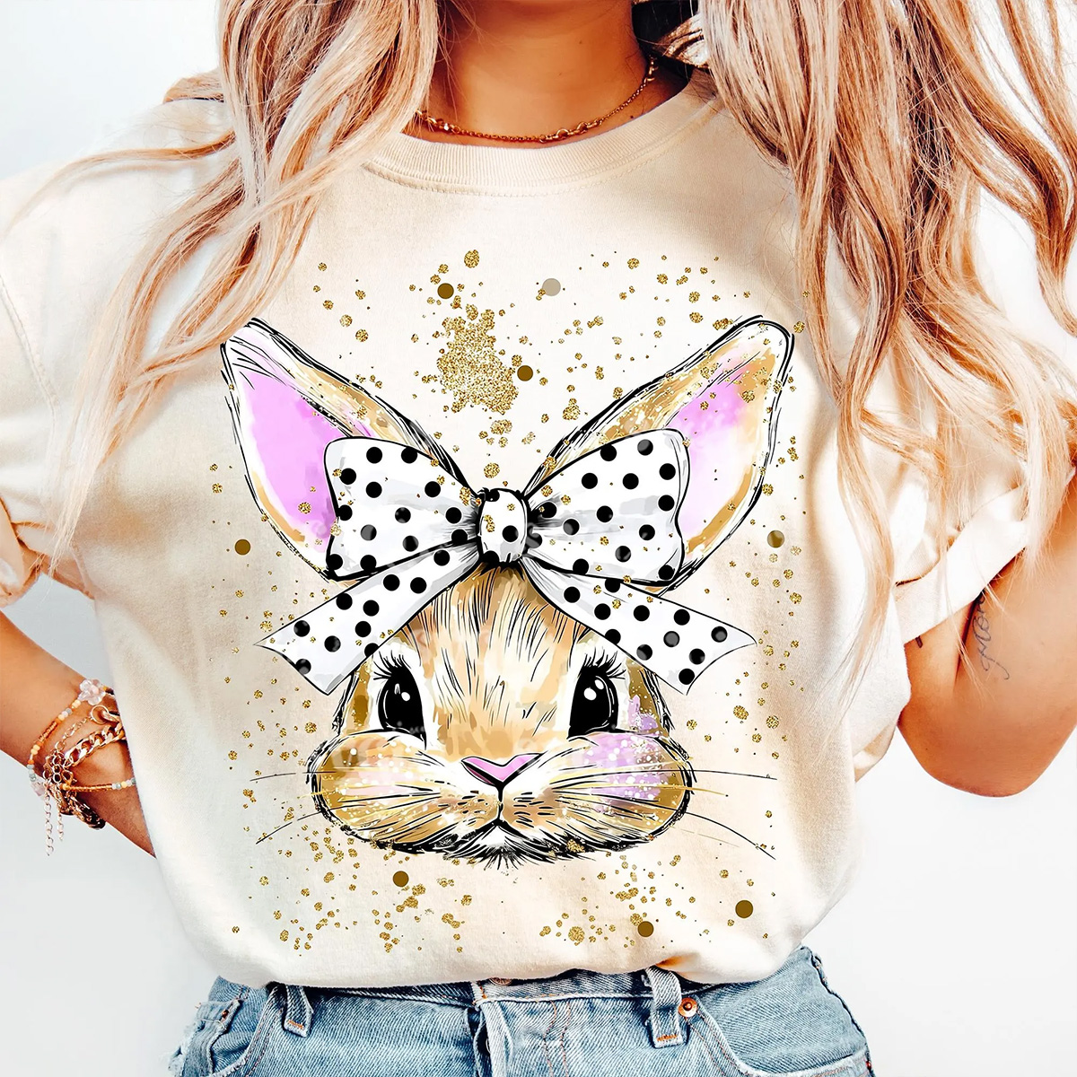 Easter Hand Drawn Bunny Printed Round Neck Short Sleeve T-Shirt