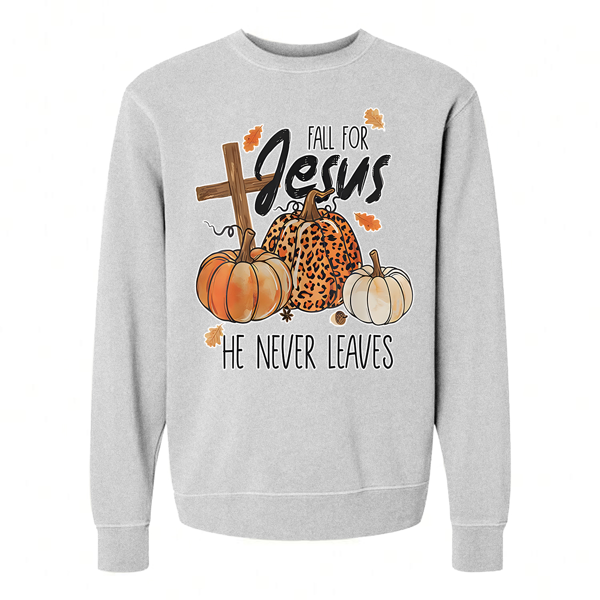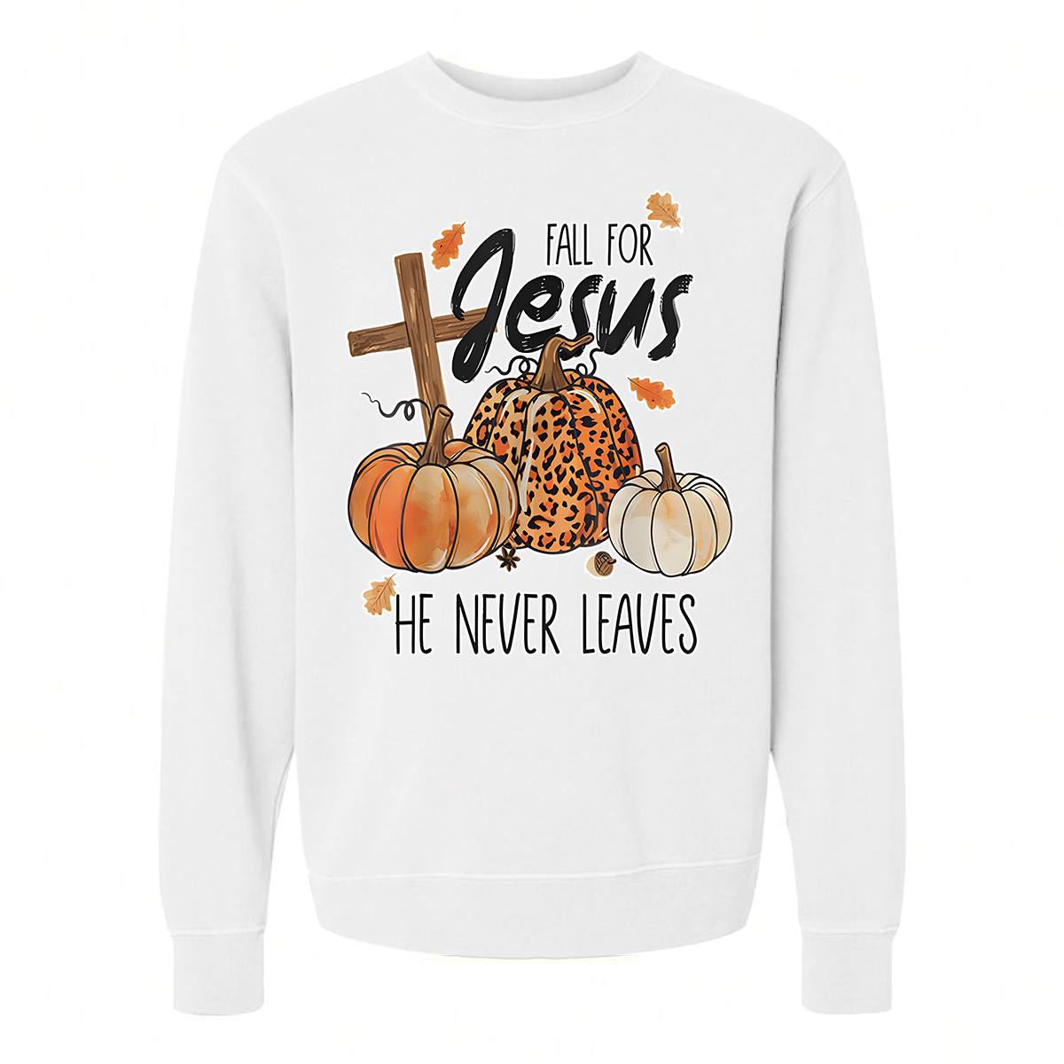 FALL FOR JESUS HE NEVER LEAVES PRINTED SWEATSHIRT 02