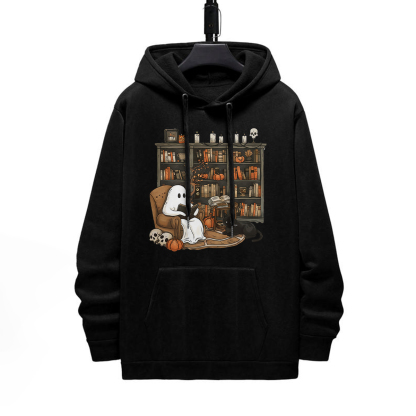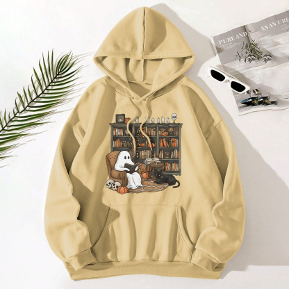 GHOST READING BOOK WITH CAT PATTERN PRINTED HOODIE