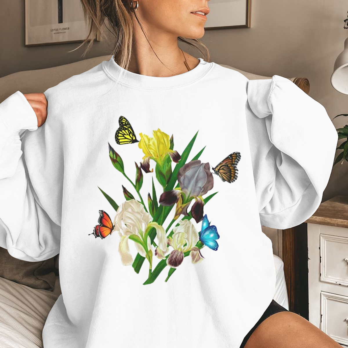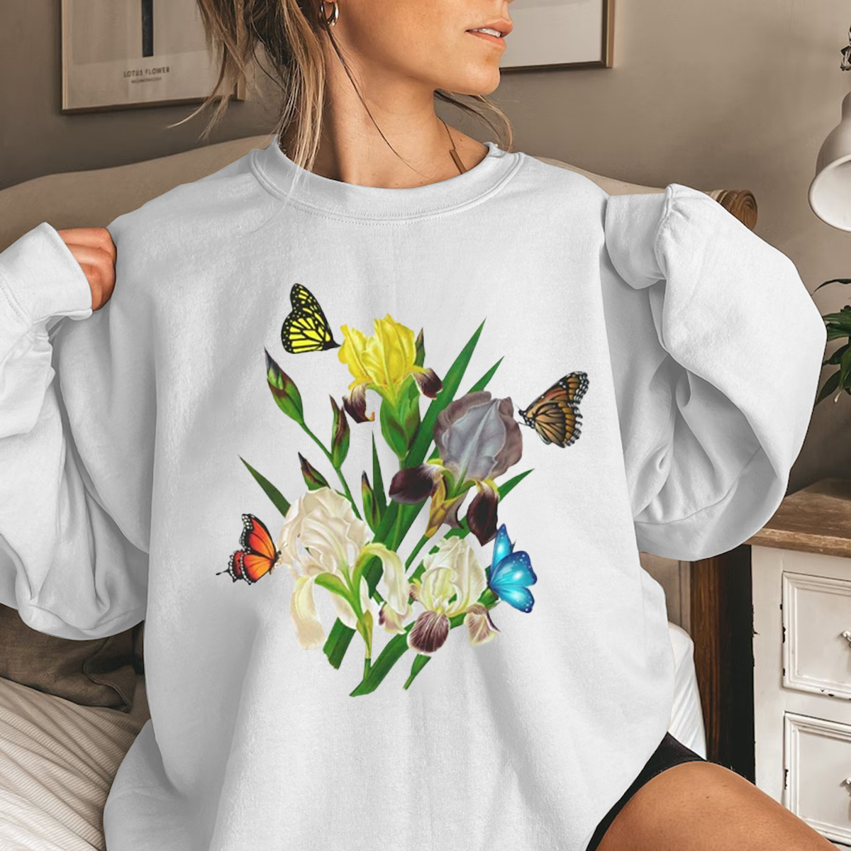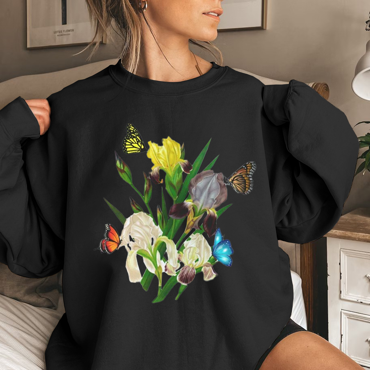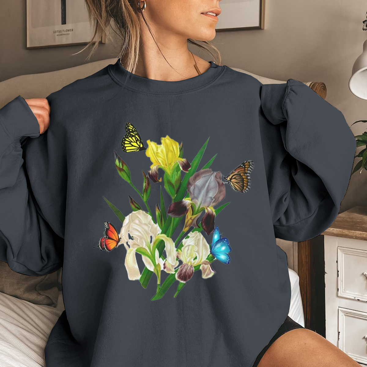 Iris Flower Sweatshirt, Butterflies and Iris Sweatshirt, Beautiful Iris Sweatshirt, Iris Floral Sweatshirt, Sweatshirt for Women, Iris Flower Gift, Floral Sweatshirt