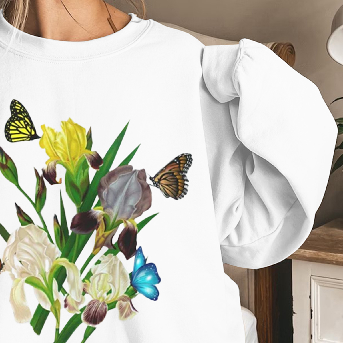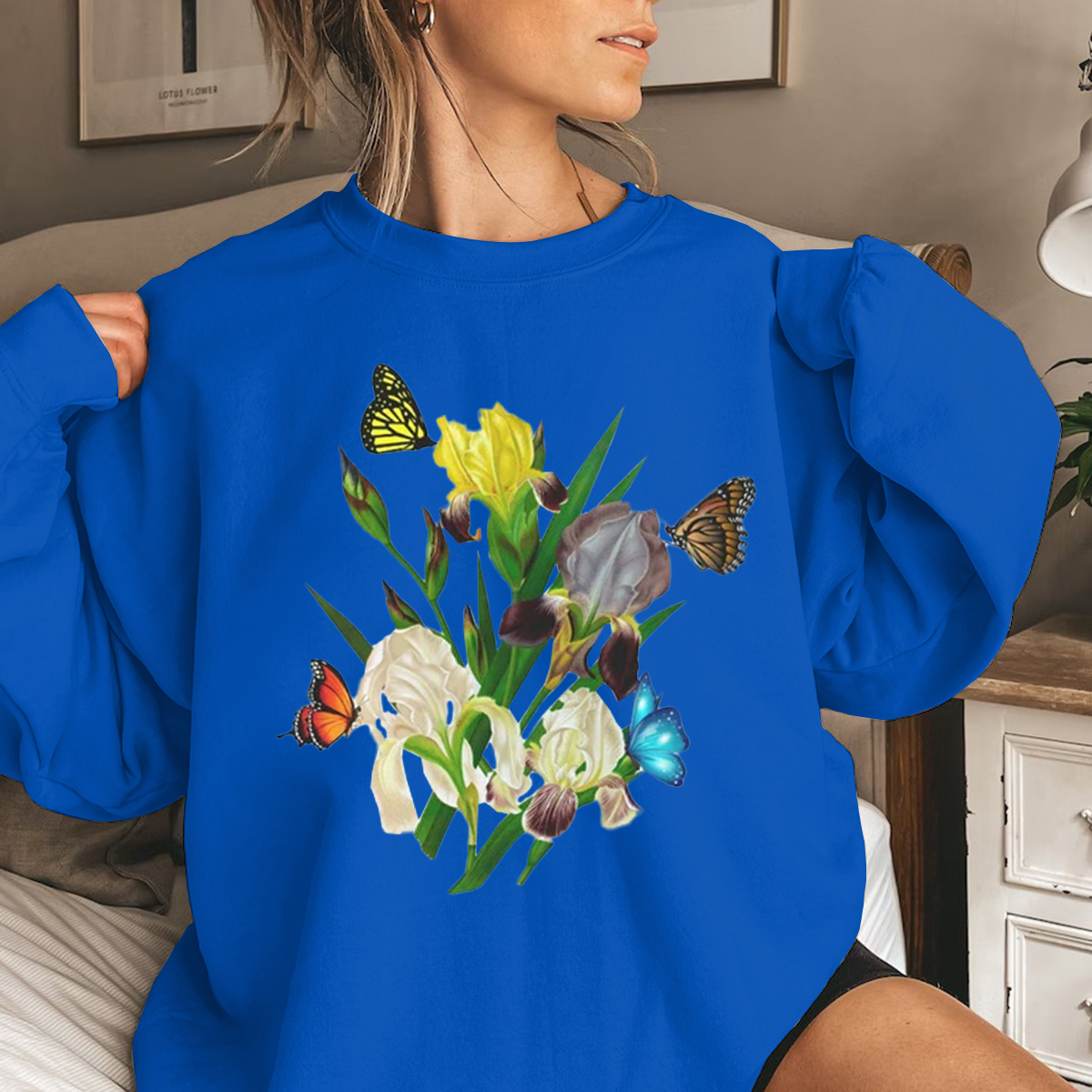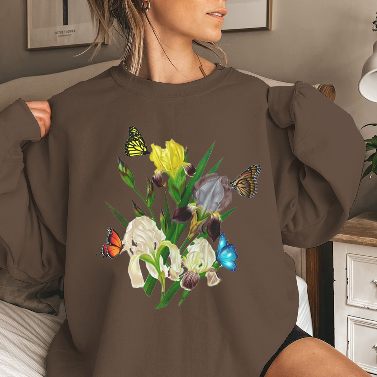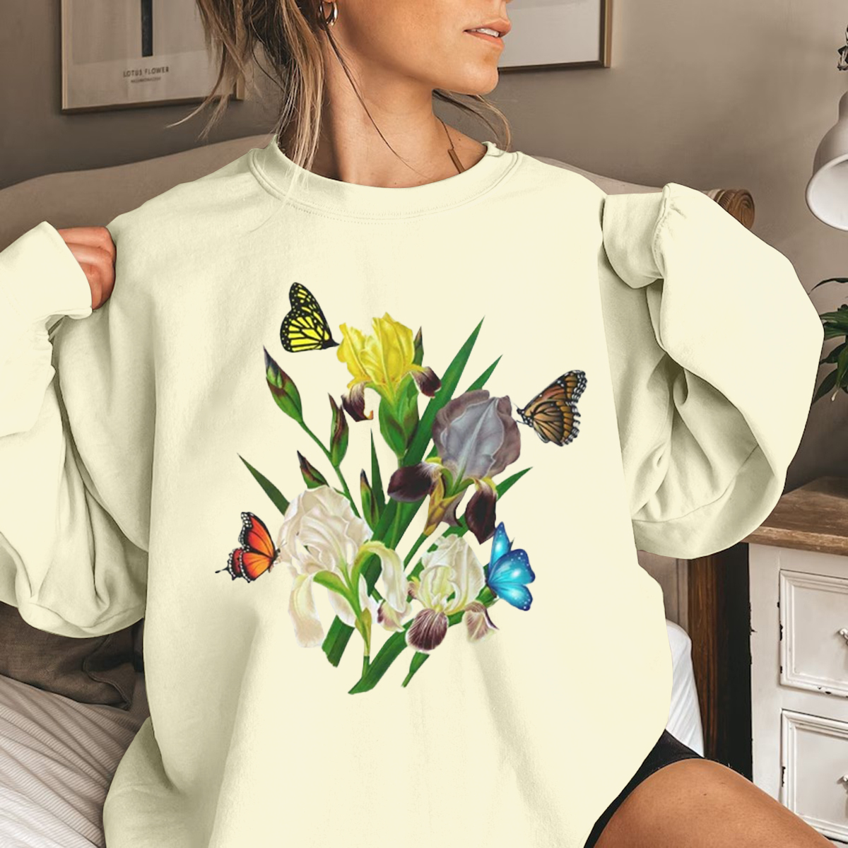 Iris Flower Sweatshirt, Butterflies and Iris Sweatshirt, Beautiful Iris Sweatshirt, Iris Floral Sweatshirt, Sweatshirt for Women, Iris Flower Gift, Floral Sweatshirt