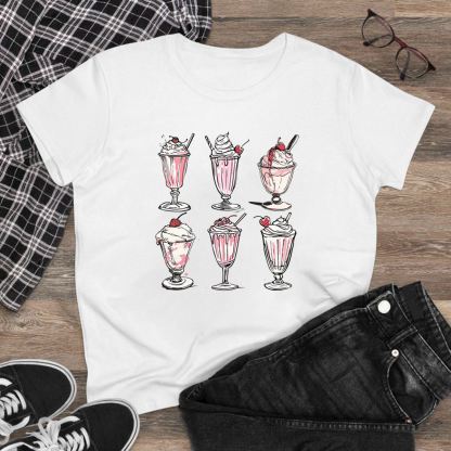 Six Cartoons Of Milkshakes Or Ice Cream Desserts With Different Decorations, Each Drink Is Served In A Tall Glass With Cream, Cherry And Other Decorative Combination Patterns On The Top, And Casual T-