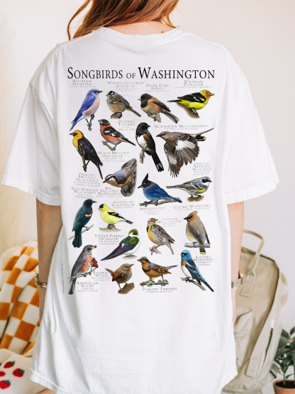 Songbirds – also known as the passerine birds – are any member of the suborder Passeri (or Oscines), of the order Passeriformes. The group including about 4,000 species in 35-55 families, which is nearly half the world’s birds. This artwork features high-quality illustrations of the various species of songbird native to the Southern California in the USA. The image is printed on a high-quality 100% men’s cotton t-shirt.