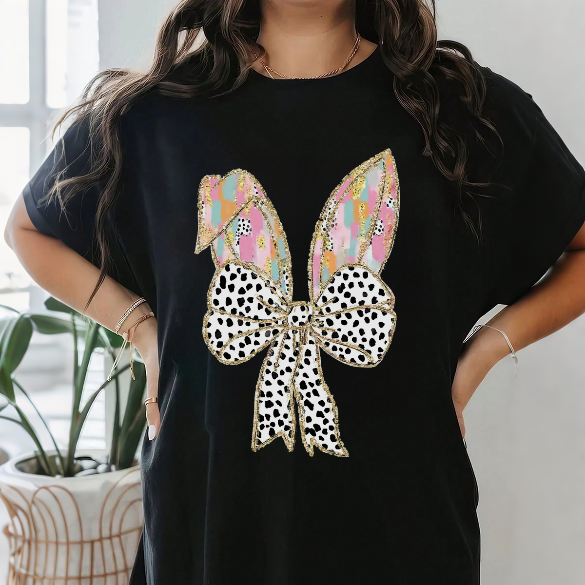 There Are Colorful Geometric Patterns On The Cartoon Rabbit Ears, With Gold Decorations On The Edges And A Big Bow With Black And White Spots, Which Is Lively And Cute, And A Casual T-Shirt.