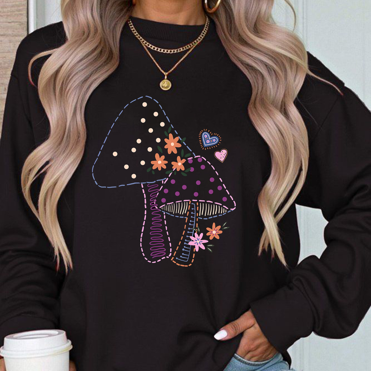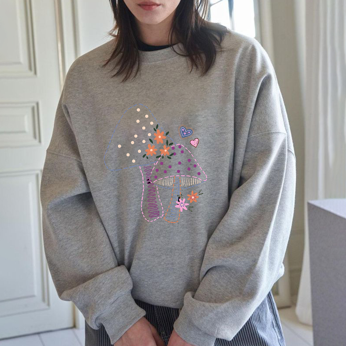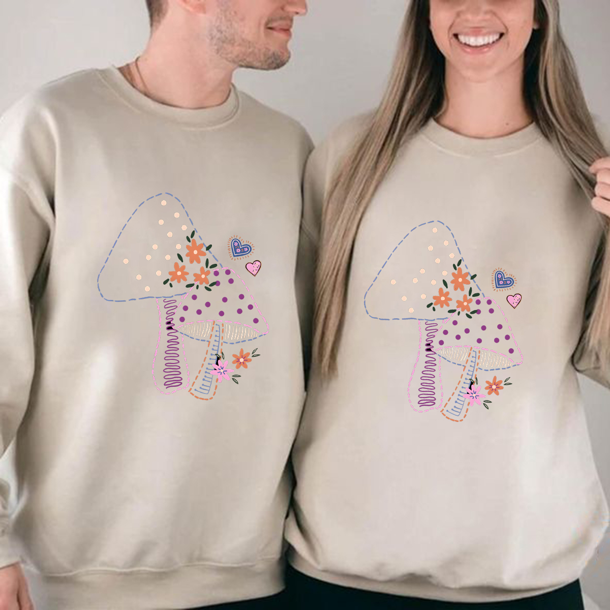 Two Mushrooms Illustration Pattern Round Neck Sweatshirt