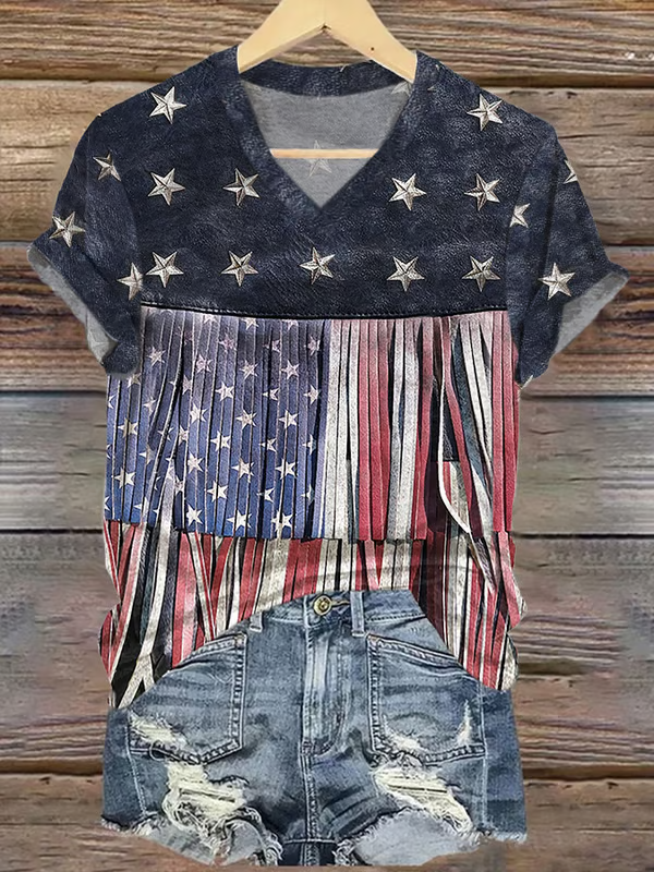 Woman'S Stars And Stripes Tassel Print Short-Sleeve V-Neck T-Shirt