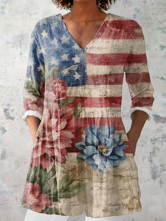 Women'S Stars And Stripes And Flower Prints V-Neck Long-Sleeved Shirt